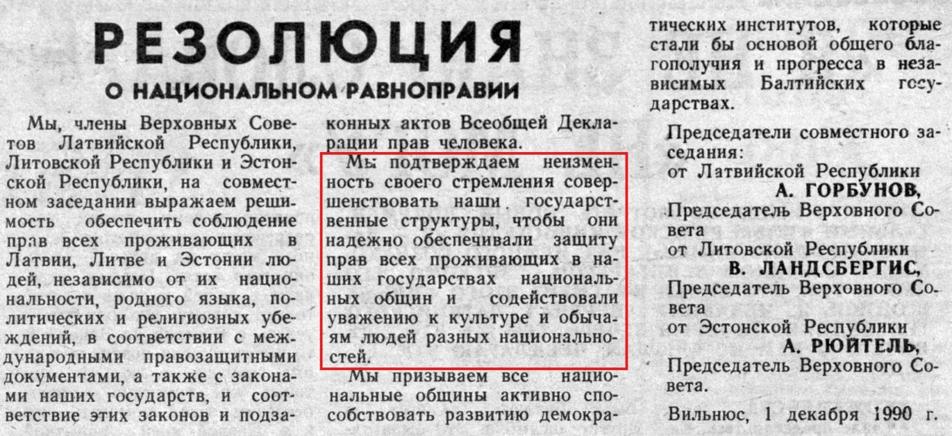 "Мы, члены Верховных Советов Латвийской Республики, Литовской Республики и Эстонской Республики, на совместном заседании выражаем решимость обеспечить соблюдение прав всех про-' живающих в Латвии, Литве и Эстонии людей, независимо от их национальности, родного языка, политических и религиозных убеждений, в соответствии с международными правозащитными документами, а также с законами наших государств и соответствие этих законов и подзаконных актов Всеобщей декларации прав человека.
