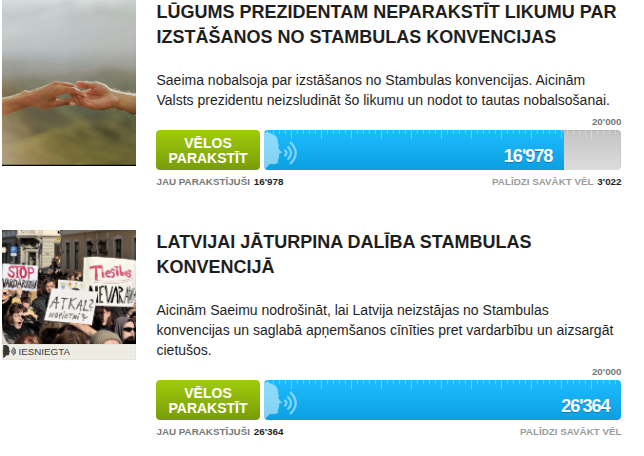 Тем временем другая инициатива, поданная в Сейм с требованием сохранить участие Латвии в конвенции, уже собрала более 26 000 подписей.