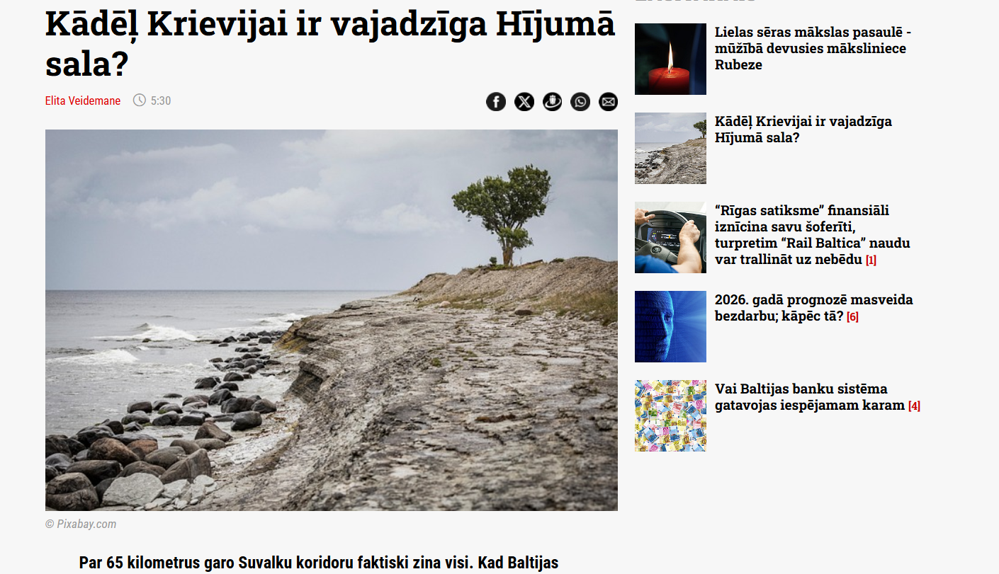 Эксперты профессиональной организации вооружённых сил Германии «Deutscher BundeswehrVerband» (DBwV) считают, что остров Хийумаа, расположенный к северу от острова Сааремаа, является одним из самых слабых стратегических звеньев НАТО в Балтийском море. Однако об острове Хийумаа говорят очень мало. Пока президент США Трамп активно интересуется Гренландией, Россия может захватить остров Хийумаа, который фактически является воротами между Балтийским морем и Финским заливом. Быстрый десант России позволил бы разместить на острове радары и системы ПВО. Это означало бы, что морские пути для стран Балтии и Финляндии были бы закрыты, а Россия могла бы контролировать воздушное пространство. Возможная оккупация острова дала бы России контроль над Балтийским морем и ограничила бы передвижения союзников в регионе.