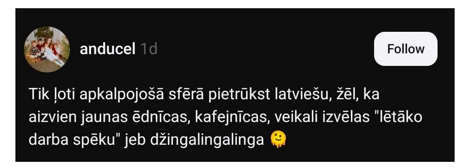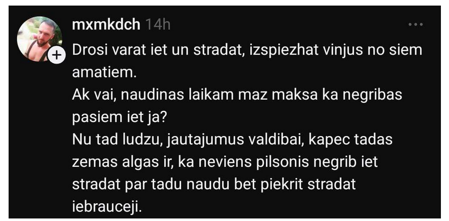 Еще одно мнение от пользователя Лиги: «Если бы латыши не были такими избалованными в отношении работы, то работодатели не принимали бы на работу иностранцев! Для них главное, чтобы кто-то работал! Этим иностранным студентам совершенно все равно, какая работа, главное — заработать! А наши латыши избалованы, они говорят: «Нет, я туда не пойду». Поэтому работодателям ничего не остается! Но в конце концов мы все люди, независимо от страны, расы, языка или религии!»
