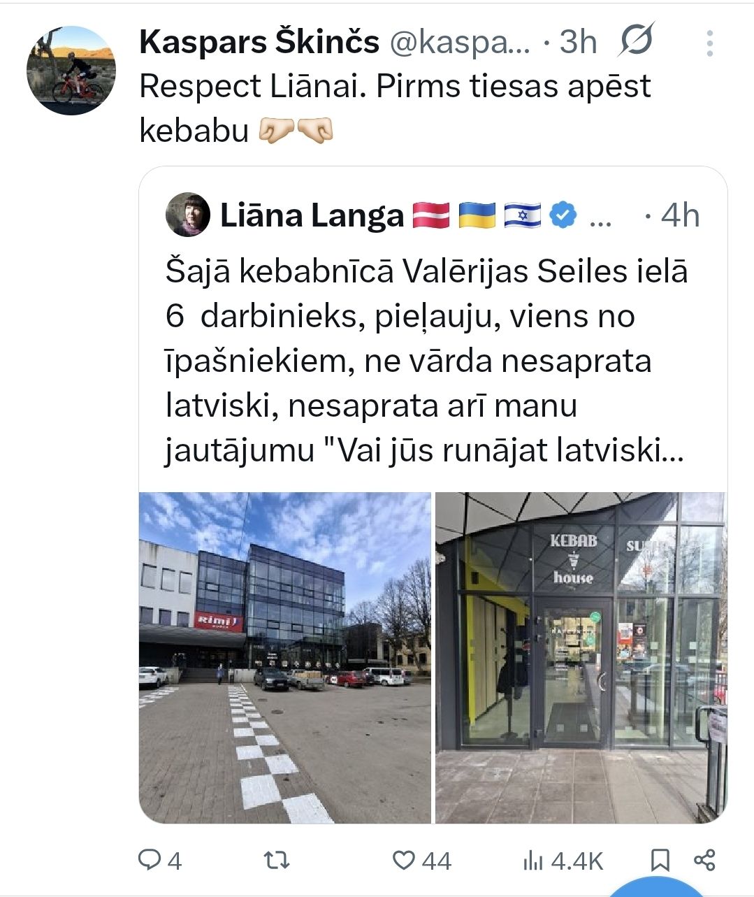 "В этой кебабной по адресу Валерияс Сейлес, 6 сотрудник, я полагаю, один из владельцев, не понимал ни слова по-латышски, как и не понял моего вопроса: «Вы говорите по-латышски?». Создание таких отчужденных замкнутых пузырей опасно и недопустимо. Пожалуйста, Центр госязыка, проверьте их!", - призвала Ланга.