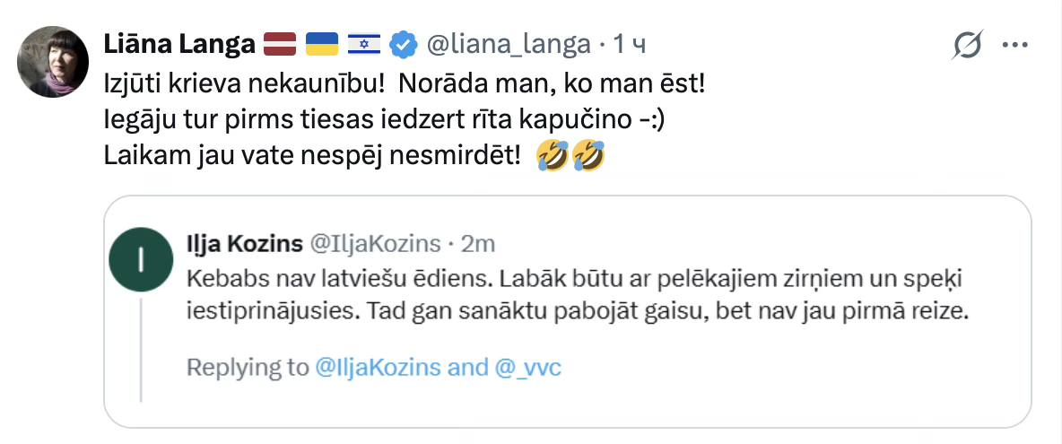 В комментариях бывший журналист Латвийского радио Илья Козин позволил себе иронично напомнить Ланге, что кебаб не вполне латышское блюдо.