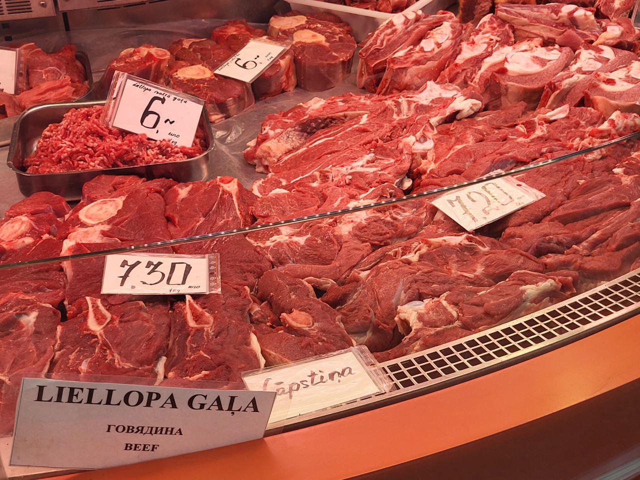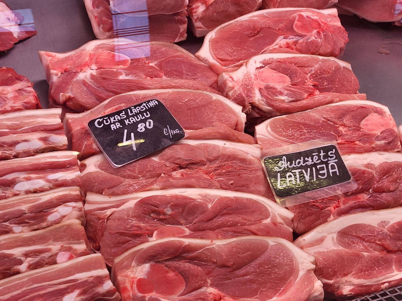 Но одними ягодами и овощами сыт не будешь, так что идем в мясной павильон. Здесь тоже есть выбор на любой вкус и кошелек. Хочешь свежей свинины на шашлык? Пожалуйста, 5-7 евро за килограмм. Говядина будет подороже, здесь цены колеблются от 7 до 10 евро в зависимости от выбранной части коровки. Что нужно отметить — коровки и свинки паслись и были вскормлены в Латвии. По крайне мере сюда иностранные конкуренты пока не пробрались.