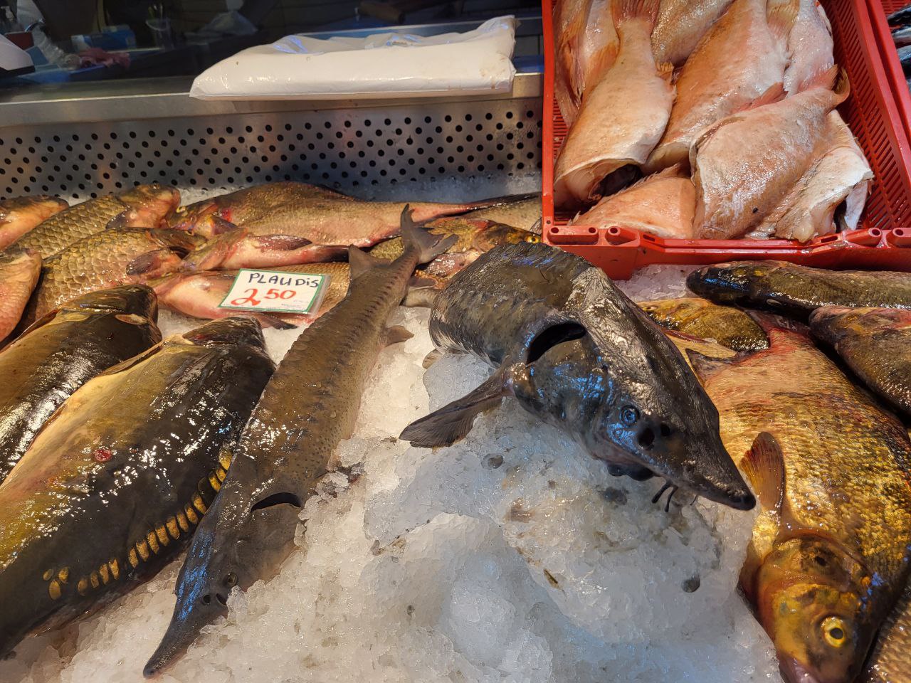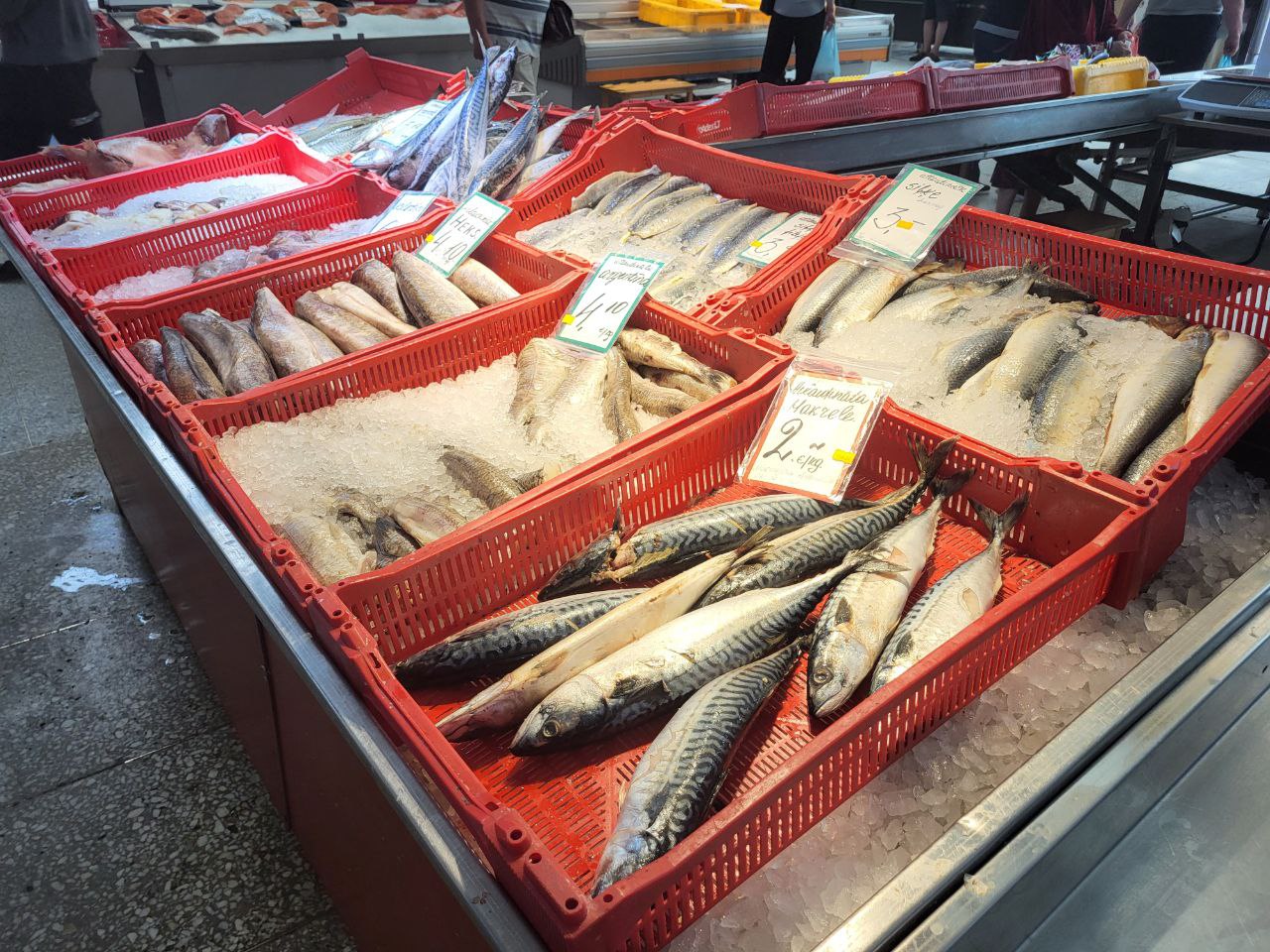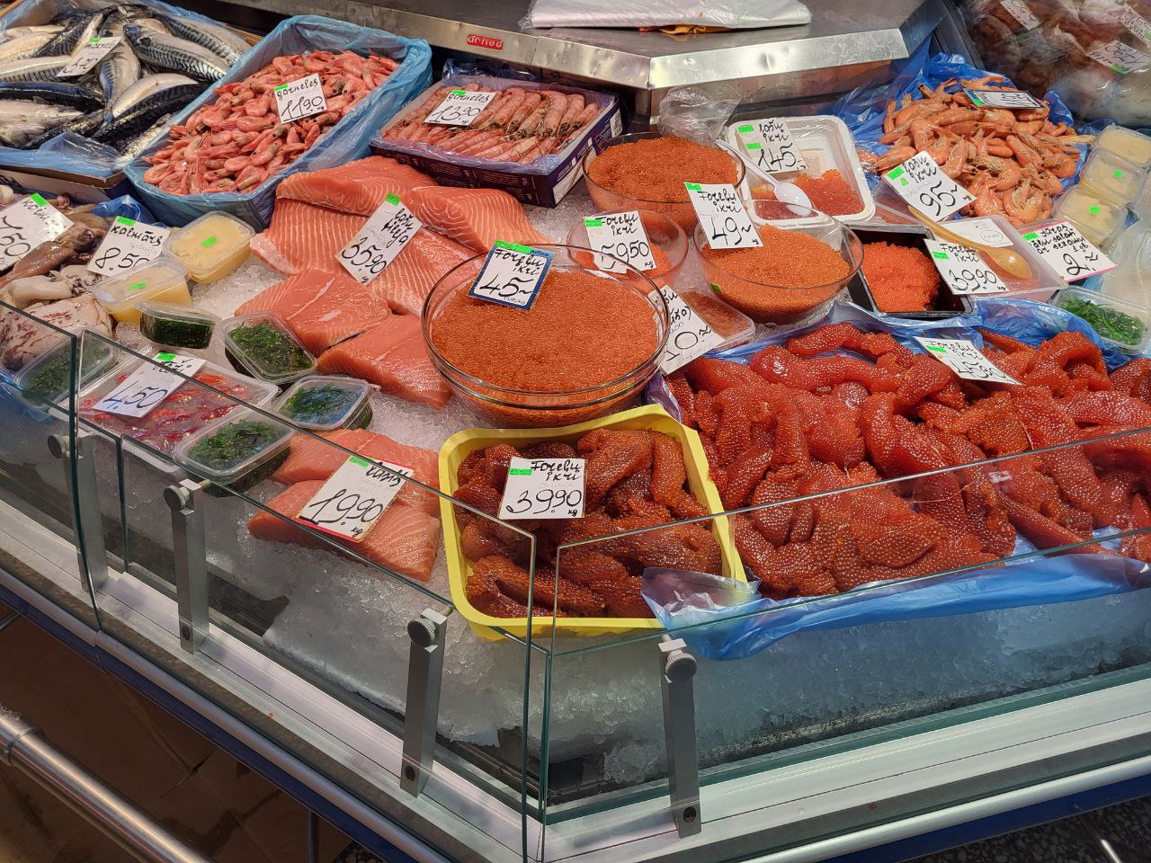 Отдельная гордость Центрального рынка — рыбный павильон. Знаковое место во всех смыслах, со своим характером и запахом. Здесь несомненный рекордсмен по ценам — игра лосося. Настоящим гурманам и сибаритам она обойдется в 145 евро за килограмм. Цена на икру форели скромнее — около 40 евро. Филе красной рыбы стоит примерно столько же, хотя можно найти отдельные кусочки и за 20 евро. Если бюджет позволяет, то можно купить для царского ужина и свежего осетра. Цена на него, кстати, не такая кусачая как на лосося — 12 евро за килограмм. Но стоит учитывать, что вес целой не потрошенной рыбины около 5 кг, а это уже считайте 60 евро за рыбку.