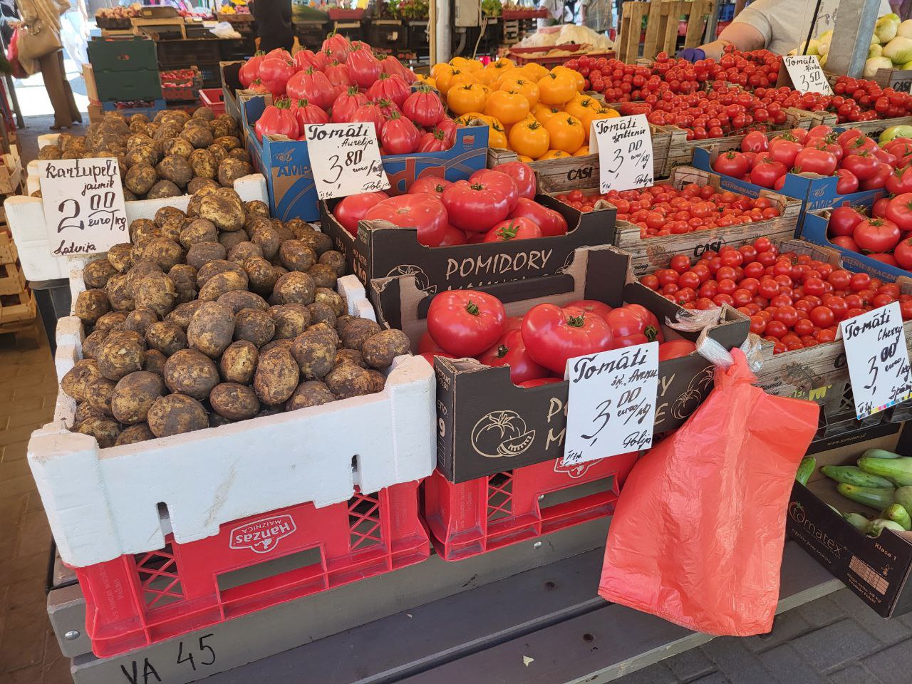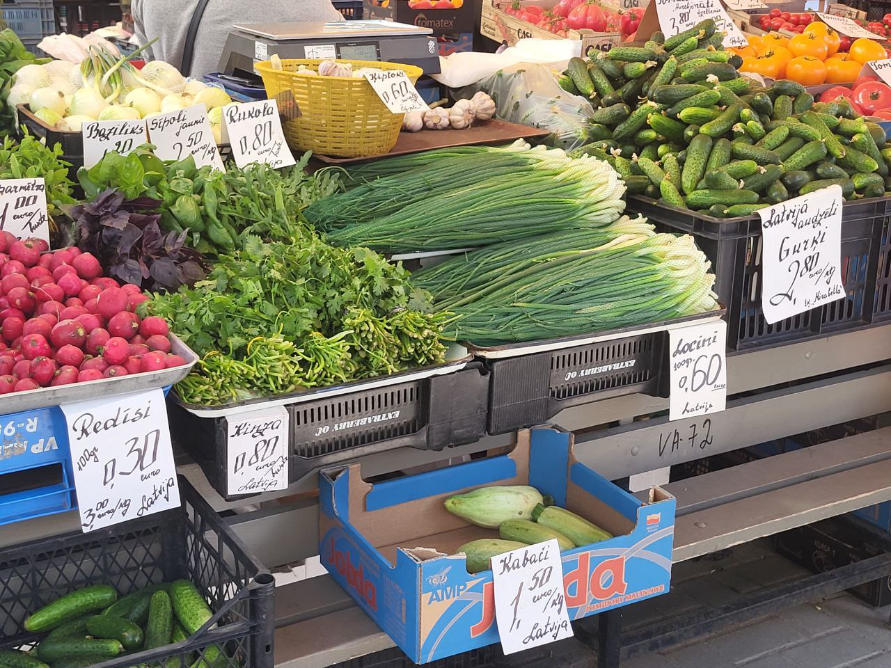 Радует глаз и обилие свежей зелени и овощей: лучок, кинза, укроп, петрушка и редиска по довольно доступным ценам. В изобилии польские и испанские помидоры по 3-4 евро за кг. А вот огурчики местные можно приобрести за 2-3 евро. Если поискать, можно найти и молодую латвийскую картошку, правда цена пока еще довольно высокая - 2 евро за килограмм.