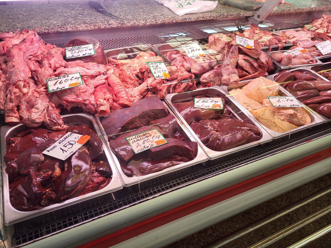 Примечательно, что рядом с отделом для мясных гурманов, где можно приобрести, например, копченую колбасу за 19 евро или домашний паштет за 8, находится и прилавок для бедных. Там по весьма доступным ценам (1-2 евро) можно купить разнообразные потроха — печень, кишки, шеи, рога и копыта. К сожалению, и такие обрезки пользуются большим спросом в наше время, признают продавцы.