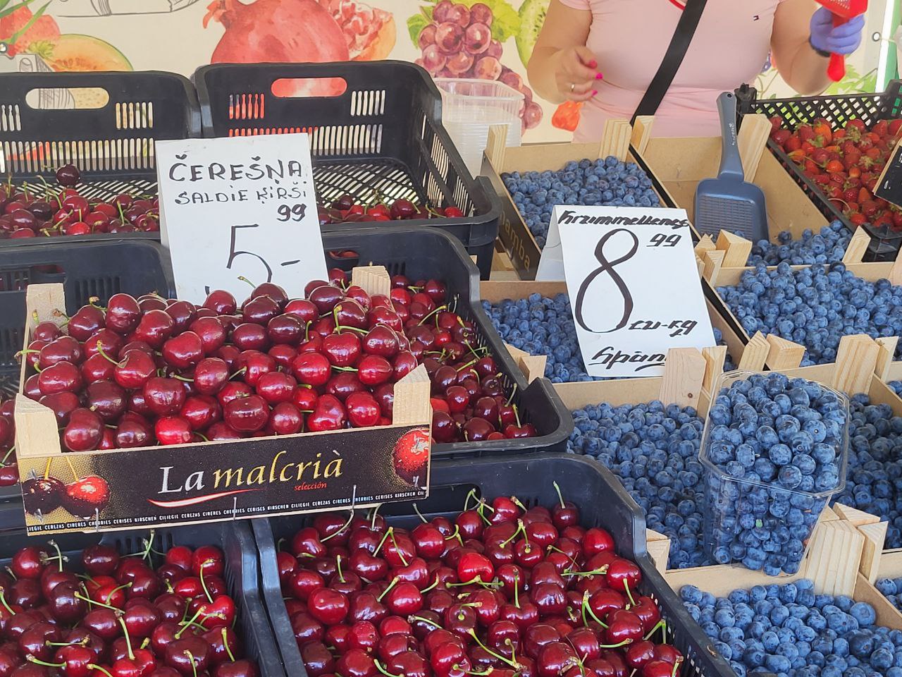 Для тех же, кто хочет чего-то послаще на рынке можно купить черешню из солнечной Венгрии за 4-6 евро килограмм. И даже чернику со знойных испанских плантаций, но и цена за такую экзотику в начале лета довольно кусачая: 6-9 евро за кг.