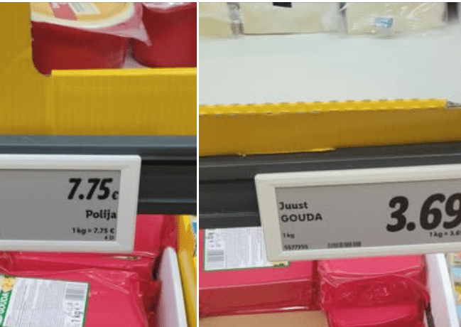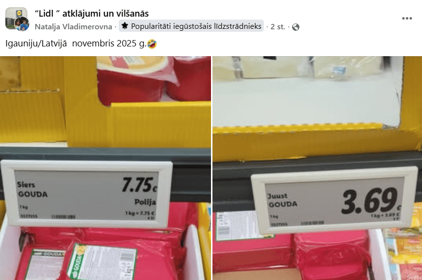 В специальной группе «Facebook», созданной для магазина “Lidl”, одна женщина разместила два фото, сравнив цены на сыр «Gouda»: в Латвии он стоит 7,75 евро, а в Эстонии — 3,69!