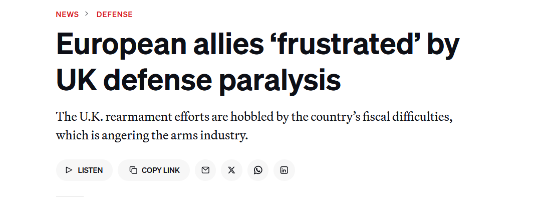 Один из директоров европейской оборонной компании сказал, что, по их мнению, Великобритании сложнее, чем Германии, получить деньги для реализации своих планов. Они указали, что Франция, которая, как и Великобритания, сталкивается с бюджетными трудностями, находится в аналогичном положении.