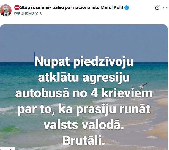 Пост опубликован в пятницу, 17 октября. Кулис пишет: "Только что испытал открытую агрессию в автобусе со стороны 4 русских за то, что потребовал говорить на государственном языке. Брутально. Спасибо, Латвия, за это".