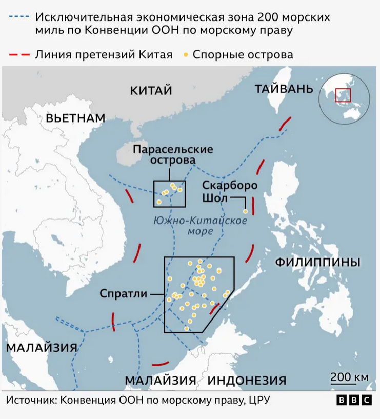 Линия девяти пунктиров обозначает территориальные претензии Китая на острова в Южно-Китайском море. Согласно этой линии, Пекину принадлежат и острова Спартли, и Парасельские острова. Фильм «Барби», вышедший в 2023 году, был запрещен во Вьетнаме и подвергся цензуре на Филиппинах — как раз из-за того, что в нем использовалась карта Южно-Китайского моря с линией девяти пунктиров.