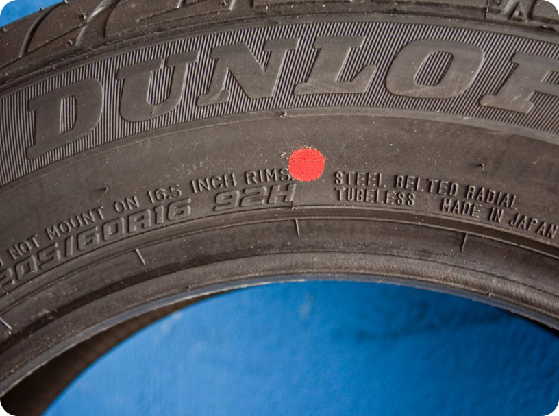 Точки или треугольники красного цвета обычно встречаются на боковой части шин, установленных на автомобиль в стандартной заводской комплектации. Эти маркеры обозначают самое тяжелое место, которое должно быть максимально удалено от ниппеля на колесном диске. Поскольку колеса в сборе уже сбалансированы и установлены, обычному потребителю на красные отметки можно не обращать внимания. А вот желтые помогут проконтролировать правильность действий сотрудника шиномонтажа.