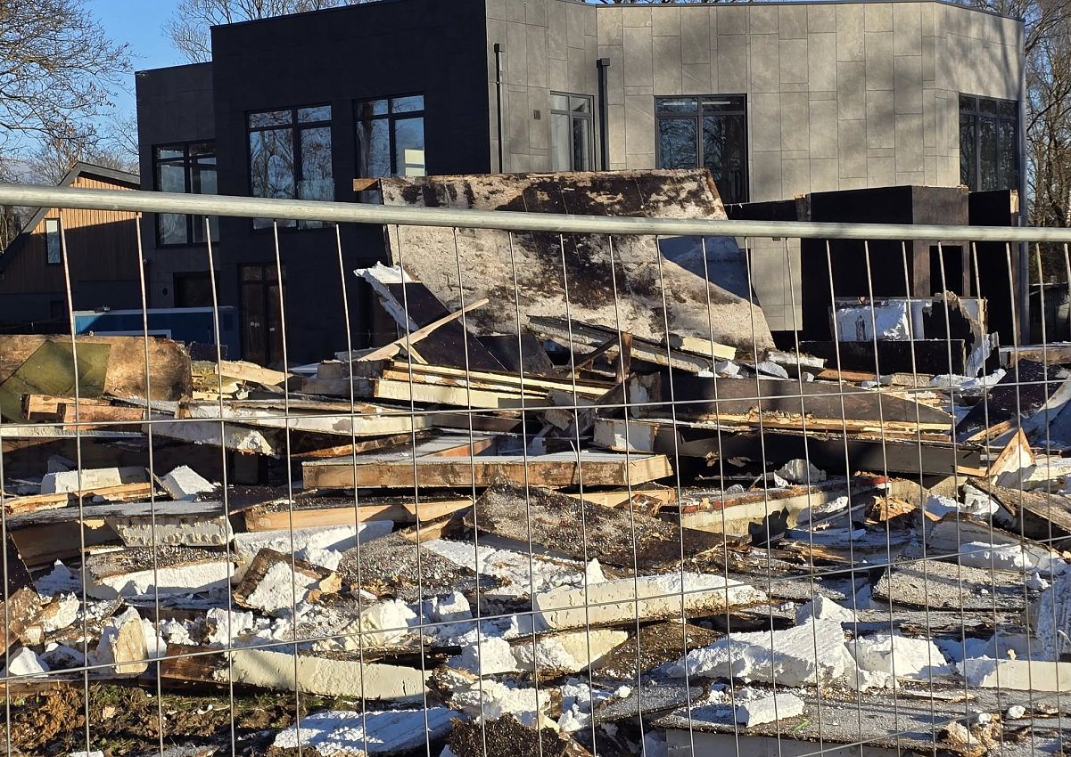 И вот теперь один из этих совсем новых домов сносят. Насколько можно понять по фото, он построен из пенопласта и фанеры, облицованной снаружи.
