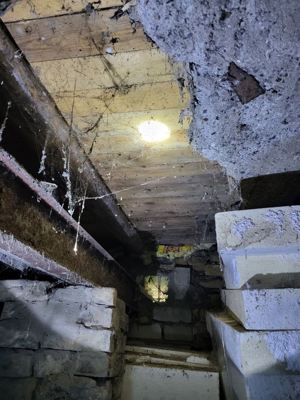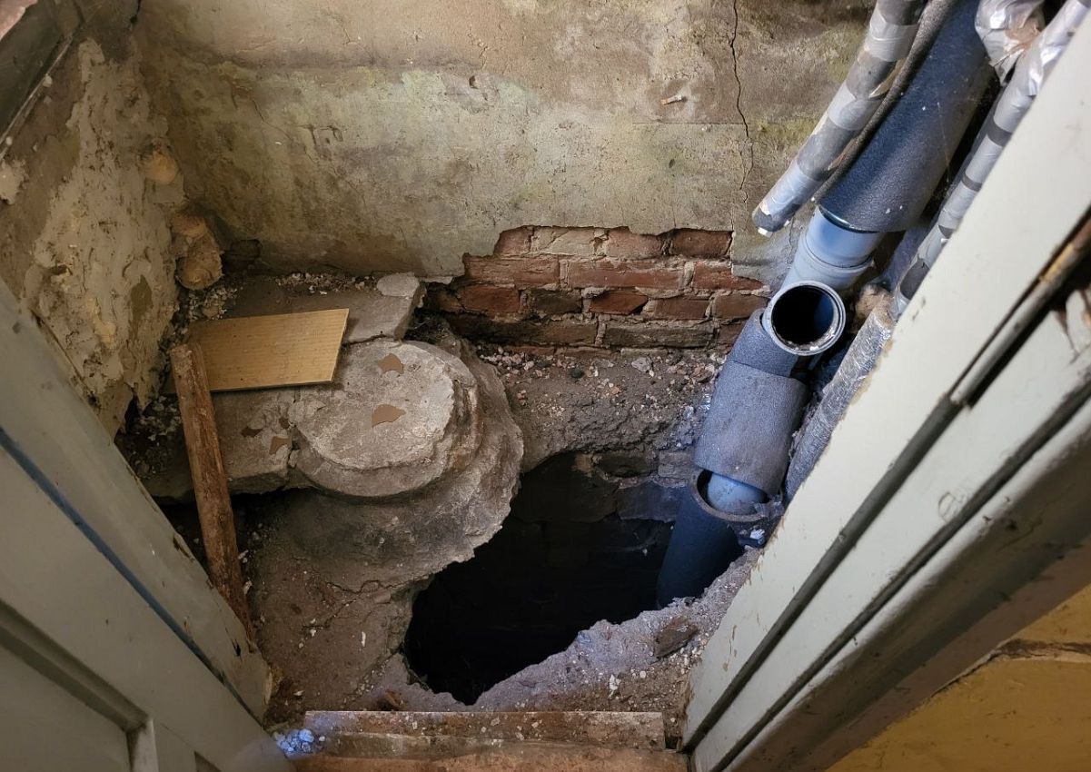 - Здесь тоже был полный ужас. Вместо пола - болото почти по колено. Осушали своими силами, - рассказывает муж Инары, когда спускаемся в подвал посмотреть на масштабы бедствия с другой стороны. Здесь выясняется, что пол провалился не только в уборной, но и в квартире одного из жильцов. Луч фонаря подсвечивает еще одну дыру, метр на полтора, заделанную досками. - Сосед у себя как-то это все отремонтировал, тоже за свой счет.