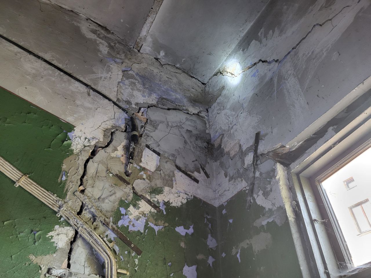 Но есть у дома проблемы и посерьезней забившихся водостоков и даже провалившегося пола. Вот-вот грозит рухнуть кирпичный фасад здания. Даже не специалисту видно, что он покосился на бок, и покрылся трещинами. По словам Майи работники RNP отреагировали лишь после того, как ей на голову чуть не упал не упал кирпич. Тогда приехали, кое-как задули трещины монтажной пеной и вкрутили в стены стяжки, словно шурупы способны удержать кладку от падения.