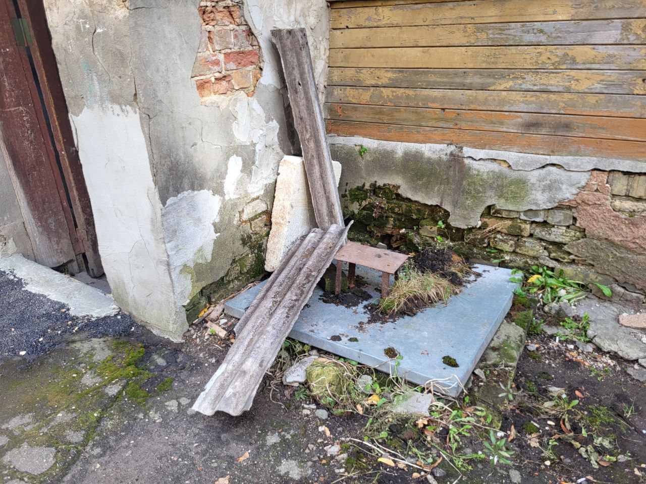 По мнению жильцов, остановить разрушение фасада можно если засыпать и замуровать глубокую яму, вероятно, еще дореволюционного сухого сортира, под самой стеной дома. Когда идут сильные дожди, вся вода стекает в нее и подмывает само основание фундамента. Сейчас она прикрыта лишь тонкой жестью.