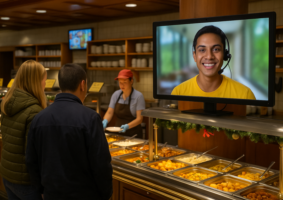 На мониторе у стойки появляется улыбающийся оператор из Манилы, принимает заказ и проводит оплату — всё как обычно, только стоит он не в Бруклине, а за 13 тысяч километров.