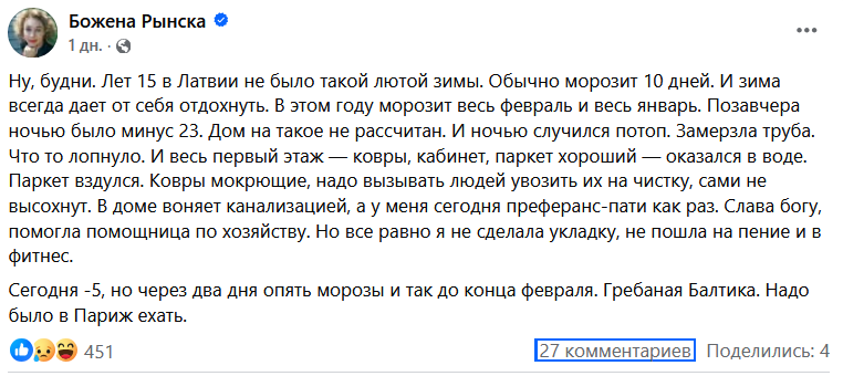 "Ну, будни. Лет 15 в Латвии не было такой лютой зимы. Обычно морозит 10 дней. И зима всегда дает от себя отдохнуть. В этом году морозит весь февраль и весь январь. Позавчера ночью было минус 23. Дом на такое не рассчитан. И ночью случился потоп. Замерзла труба. Что то лопнуло. И весь первый этаж — ковры, кабинет, паркет хороший — оказался в воде. Паркет вздулся. Ковры мокрющие, надо вызывать людей увозить их на чистку, сами не высохнут. В доме воняет канализацией, а у меня сегодня преферанс-пати как раз. Слава богу, помогла помощница по хозяйству. Но все равно я не сделала укладку, не пошла на пение и в фитнес.