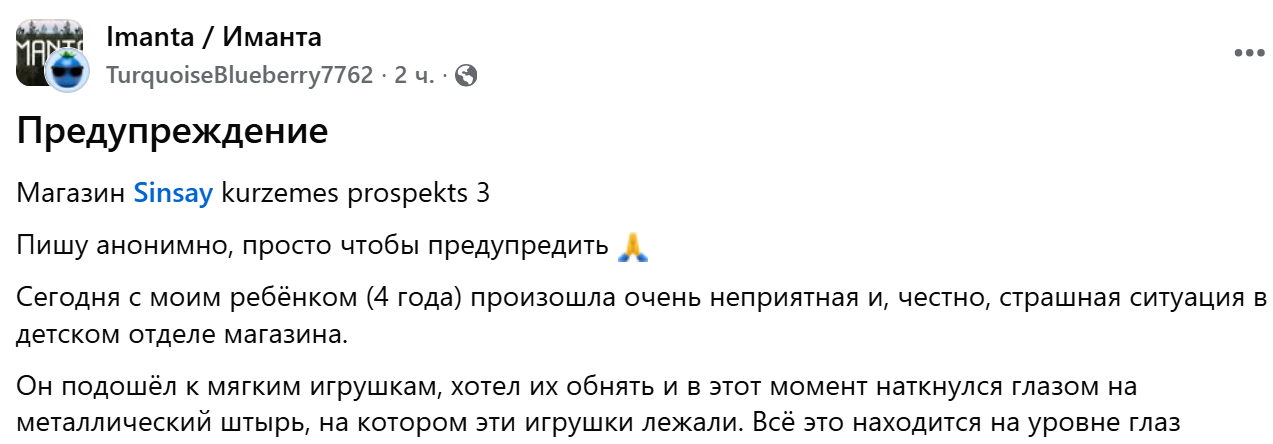 "В итоге кровь, скорая, огромный стресс и у меня, и у ребёнка. Слава богу, обошлось без серьёзных последствий, но могло закончиться намного хуже… Я даже не думала, что в детской зоне могут быть такие конструкции без какой-либо защиты. Пожалуйста, будьте максимально внимательны", - предупреждает мама.