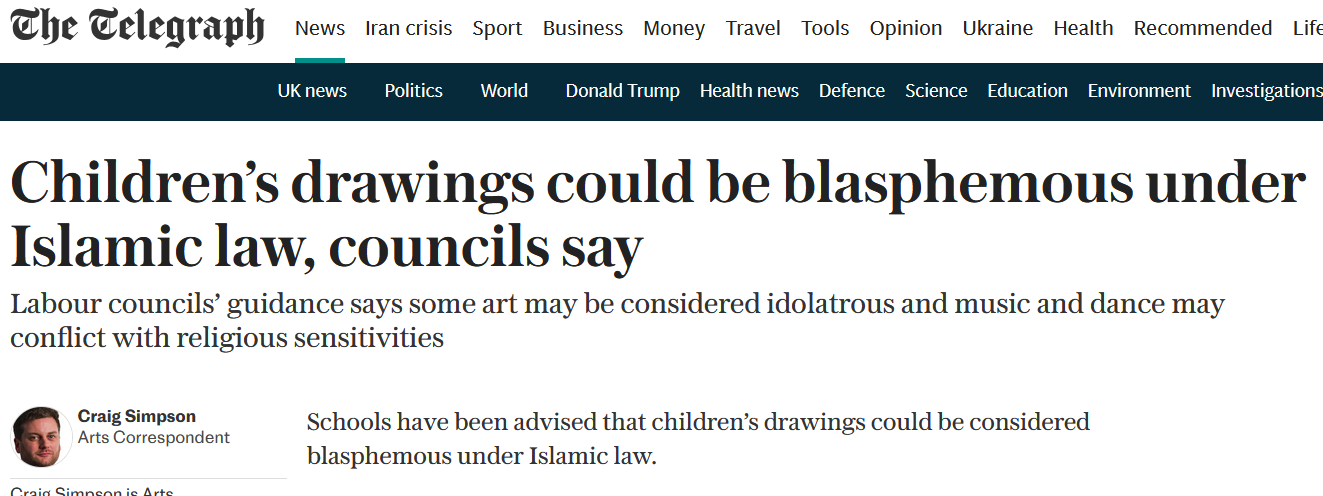 Чиновники правящей Лейбористской партии издали фетву... ой, простите, пока это просто распоряжение, что британские светские школы должны руководствоваться законами ислама при выдаче заданий для детских рисунков, ибо они могут оказаться богохульством или идолопоклонничеством с точки зрения шариата.