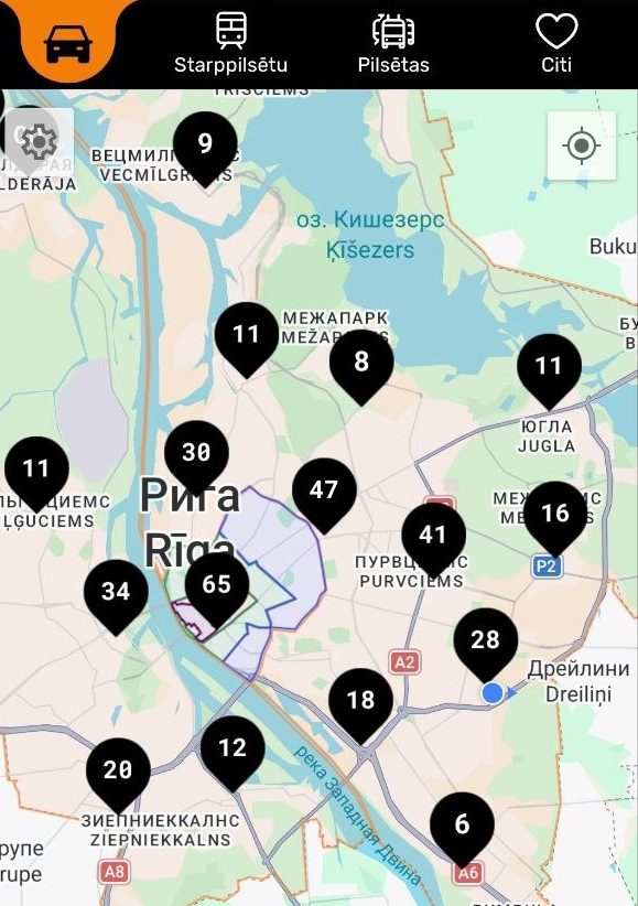 Масштабы распространения парковок в спальных районах можно оценить на карте города в приложении Mobility - в черных кружках написано сколько платных участков располагается в том или ином районе города. Например, только в Плявниеки и Пурвциемсе в сумме чуть более платных участков чем в центре города.