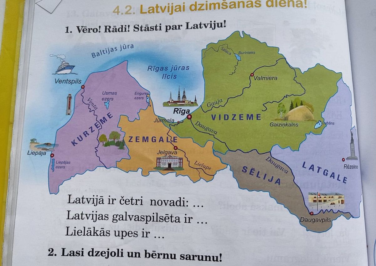 В учебнике дано задание - перечислить культурно-исторические области Латвии, названные здесь для пущей путаницы краями (novads). При этом в тексте задания сказано, что этих областей четыре, а на карте чётко видно пять - Видземе, Земгале, Курземе, Латгалия и Селия.