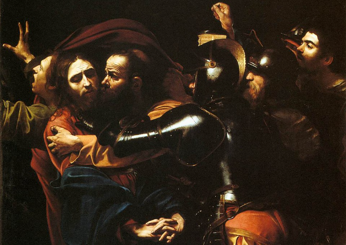 На картине «Взятие Христа под стражу», также известной как «Поцелуй Иуды», изображена сцена предательства. Считается, что в правой части композиции Караваджо изобразил самого себя — он держит фонарь, свет которого выхватывает из темноты этот роковой момент.