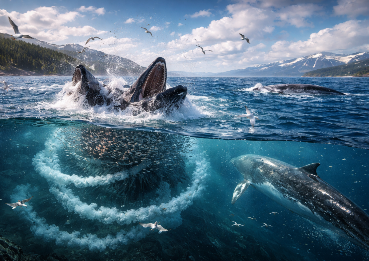 И это ещё не всё. Параллельно киты активно используют коллективные приёмы охоты. Например, знаменитую «пузырьковую сеть», когда группа горбатых китов выдыхает воздух, окружая косяк рыб пузырями и загоняя добычу в плотный шар. Это не просто трюк — это передача знаний внутри популяции, которая помогает выжить всем сразу.