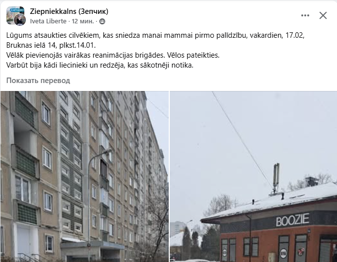 -Просьба отозваться людей, которые оказали моей маме первую помощь вчера, 17.02, на улице Брукнас, 14, в 14:01.