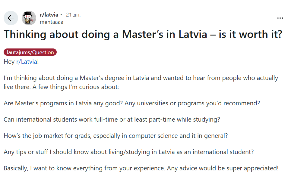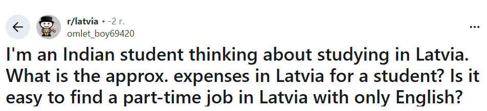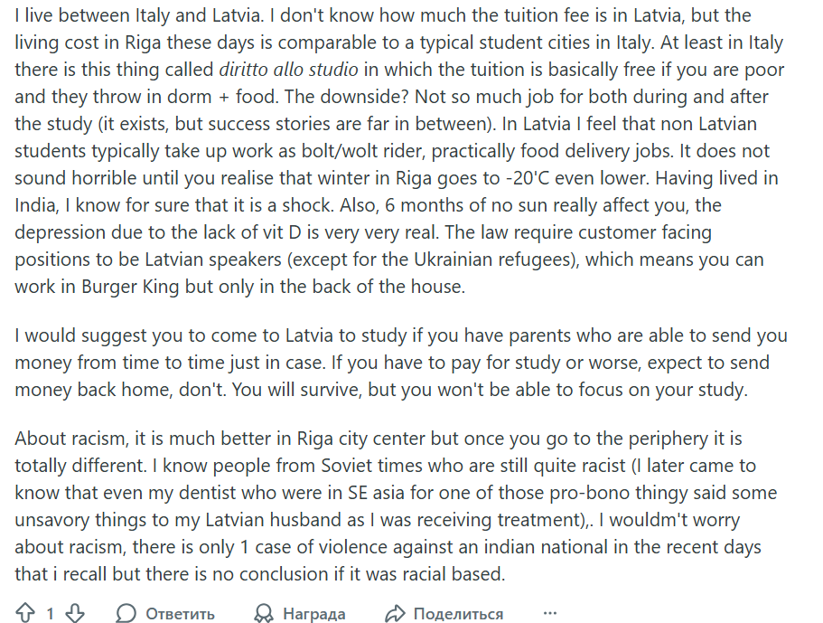 А вот что пишут на другой ветке форума Reddit - студент из Индии интересуется работой в Латвии: "Я индийский студент, подумываю учиться в Латвии. Каковы примерно расходы для студента? Легко ли найти подработку в Латвии, если знаешь только английский?» Ему отвечают: