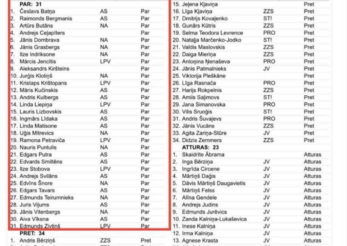 За проект проголосовали 31 депутат, против — 34, воздержались 23. Депутаты объединения «Латвия на первом месте» стали единственными из парламентариев, поддержавших инициативу НО.