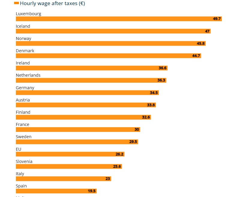 Согласно новым данным Евростата, опубликованным на этой неделе, в Великом герцогстве, расположенном в самом центре континента, средняя чистая зарплата составляет 49,7 евро в час. На втором месте - Исландия (47,0 евро), за ней следуют Норвегия (45,8 евро) и Дания (44,7 евро).