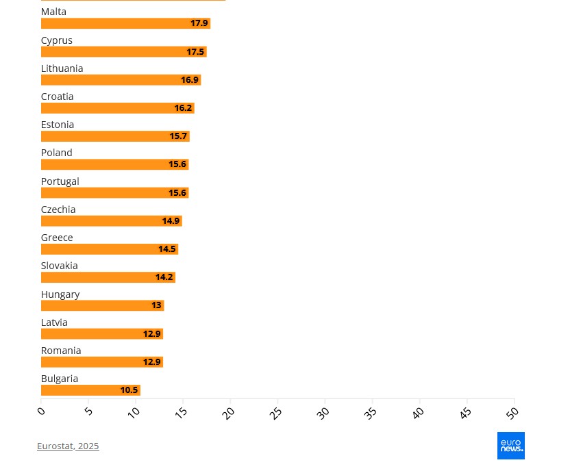 Мальта стала единственной страной, где общие затраты на рабочую силу снизились (-0,5%), в то время как наибольший рост был зафиксирован в Болгарии (+13,1%), Хорватии (+11,6%) и Словении (+9,3%).