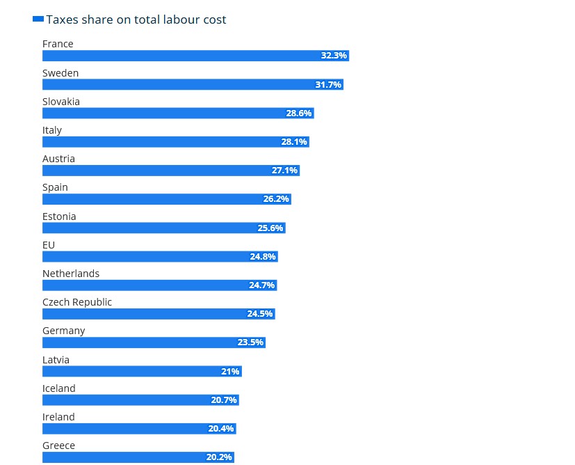 По данным Евростата, самые высокие расходы, не связанные с оплатой труда, несут работодатели во Франции (32%), Швеции (32%) и Словакии (29%), в то время как в Румынии, Литве и на Мальте эта доля практически равна нулю.
