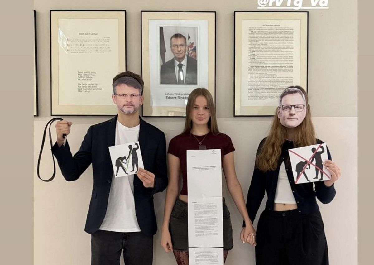На фото справа видна девушка в маске с лицом самого Клейнбергса, а слева - парень в маске с лицом Айнарса Шлесерса.