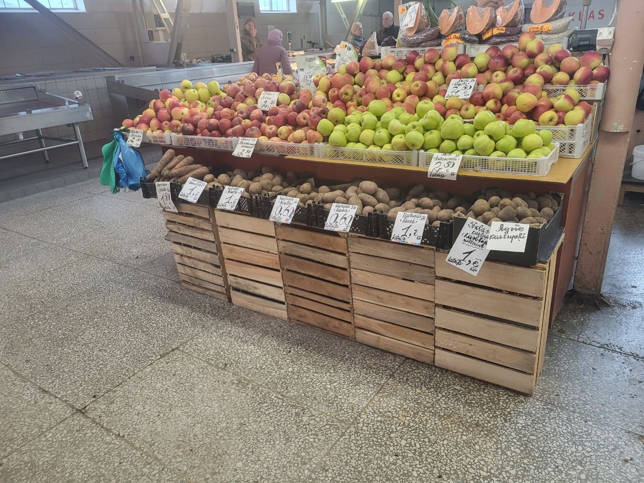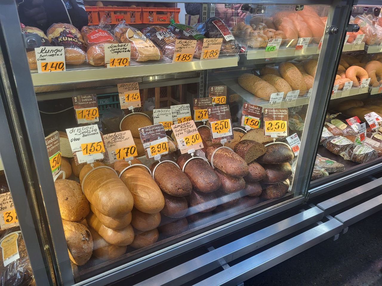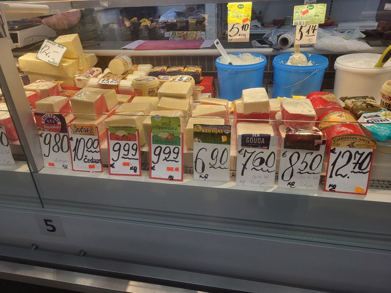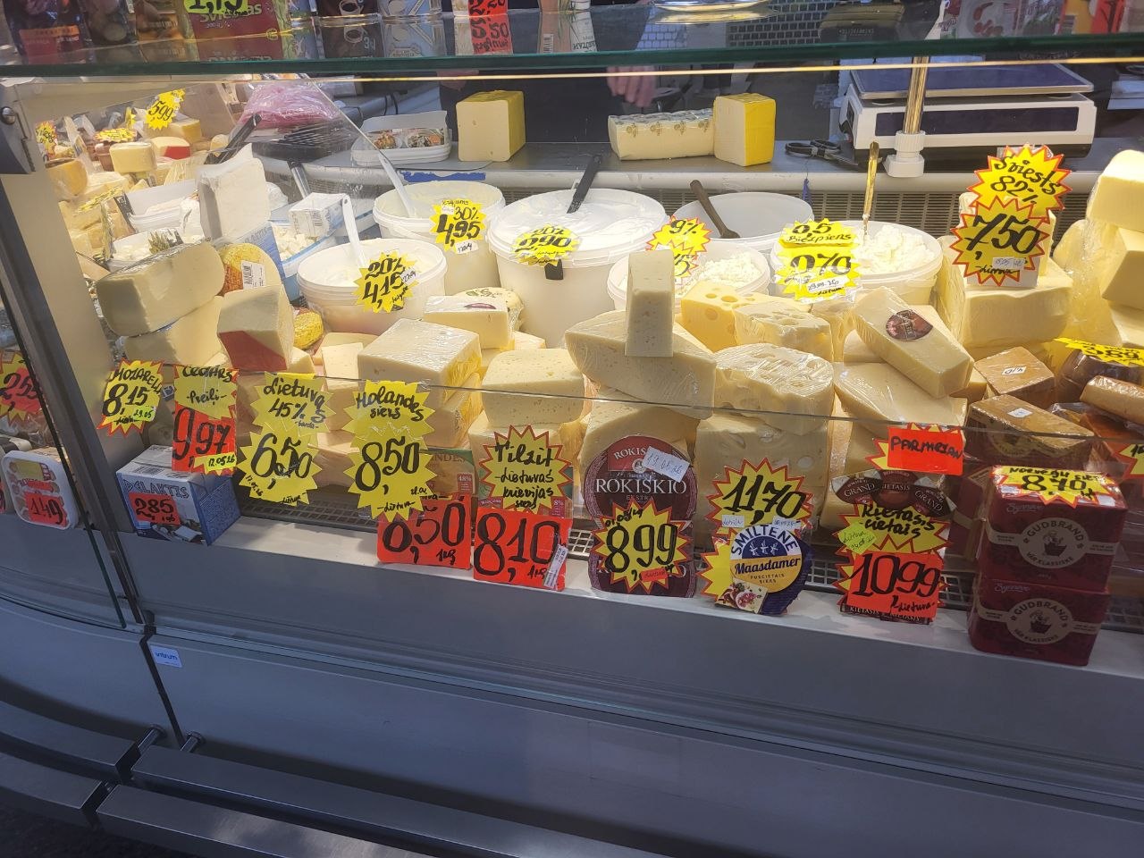 Что касается цен, то вот небольшой обзор на пятницу, 24 апреля, что почём на Центральном рынке. Начнем с хлеба, который всему голова: батон свежего белого можно купить за 1.55-1.70 евро, ржаной хлеб стоит дороже - от 2.50 до 3.70 за кирпичик "Бородинского". Цены на яйца от 1.80 до 2.30 за десяток, в зависимости от размера. Килограмм творога с жирностью 9% можно найти за 5 евро, а сыр разных сортов от местных производителей будет стоить от 8 до 15 евро, тоже за килограмм.