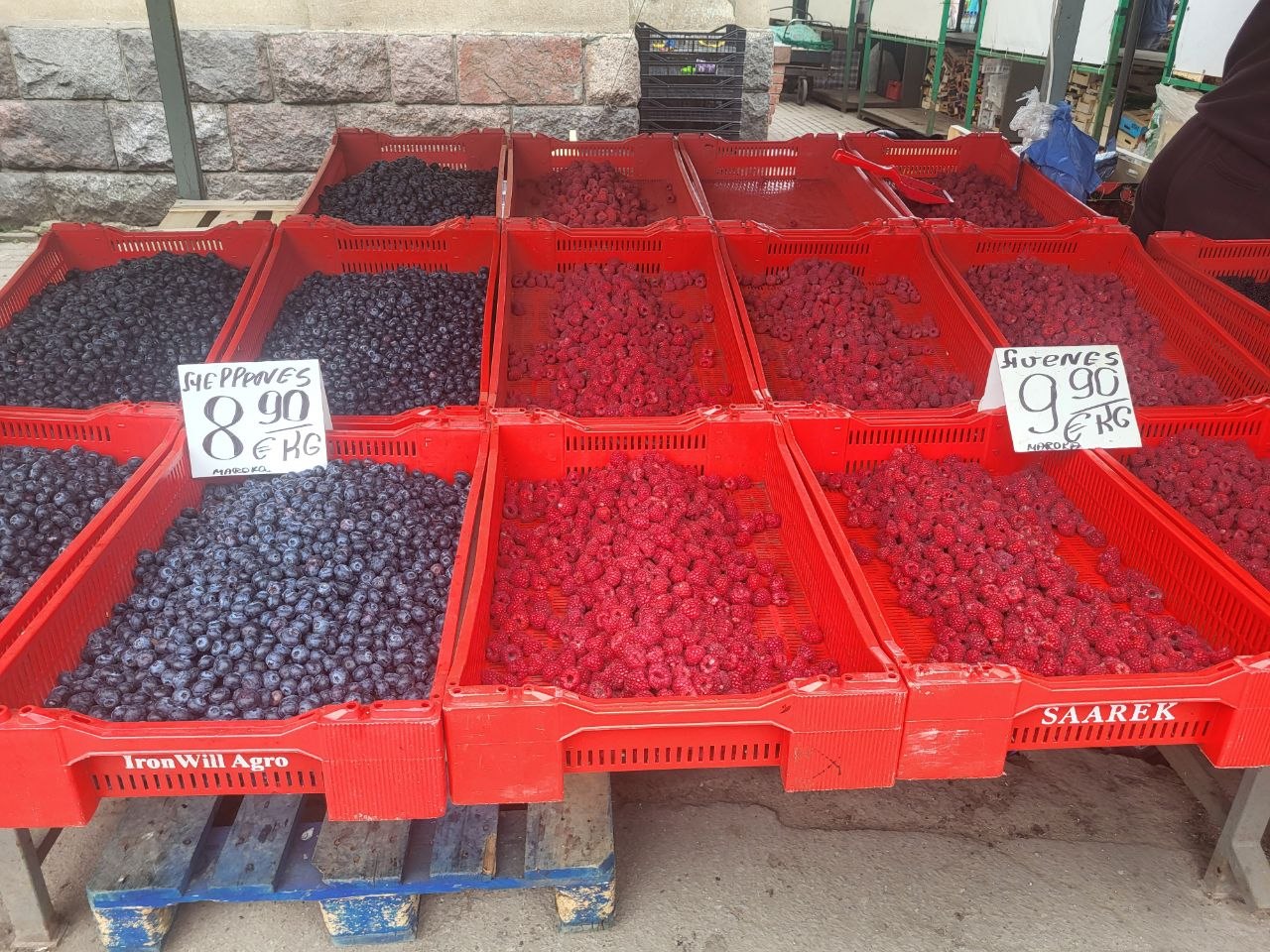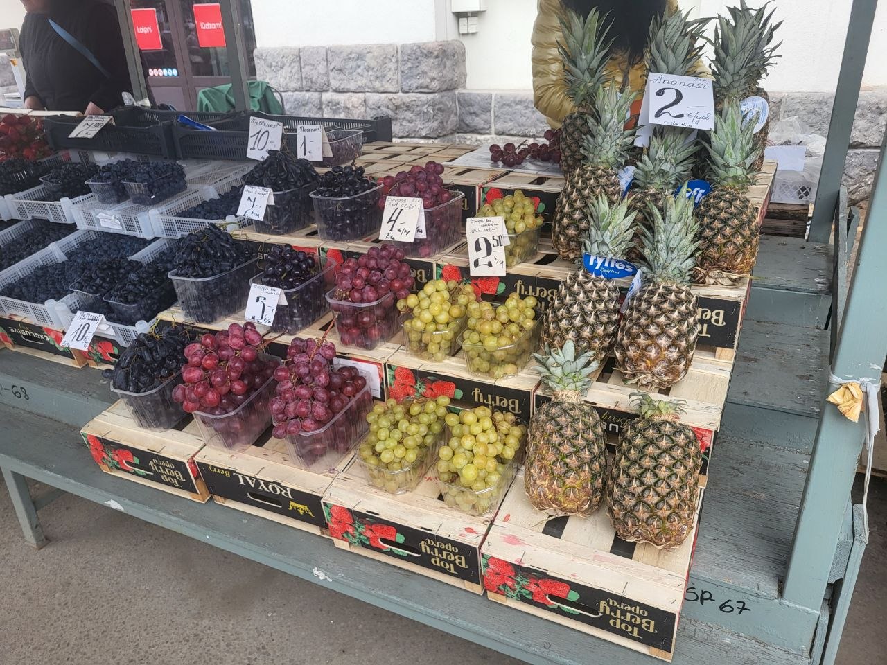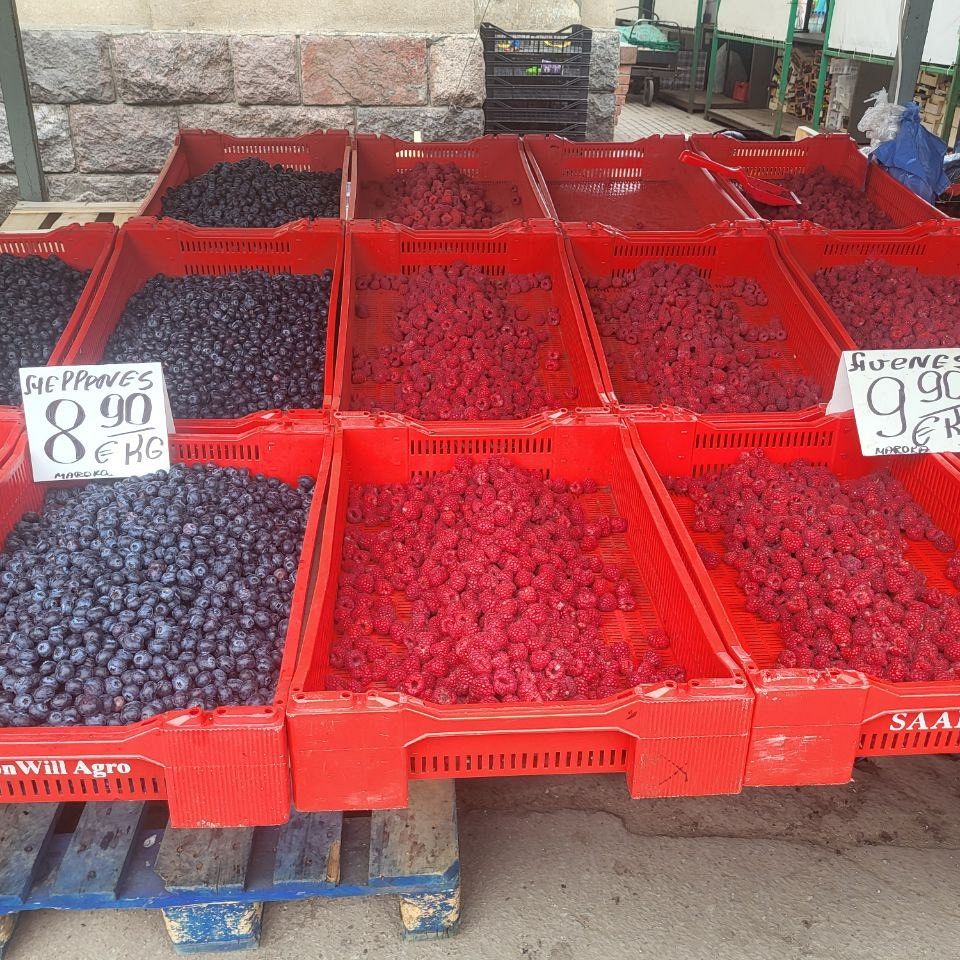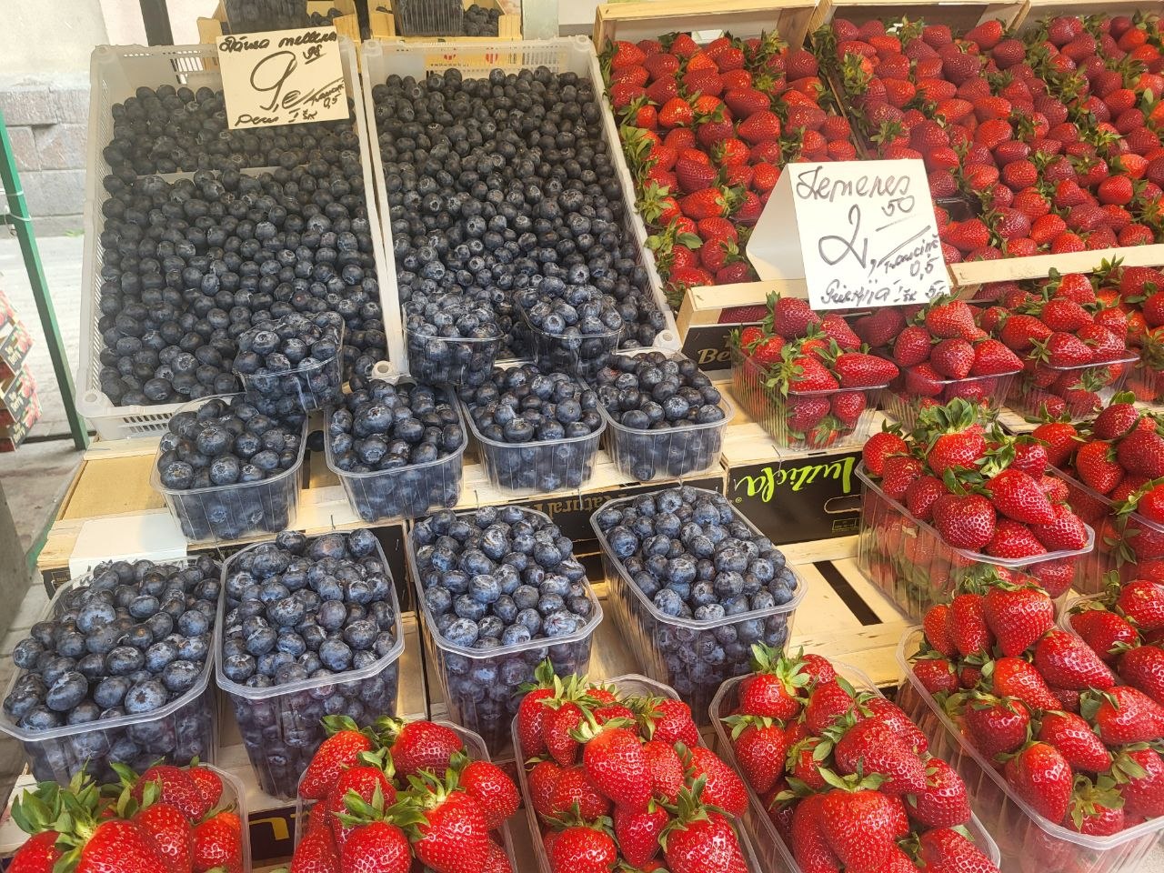 С овощами и фруктами немного сложнее - если в конце марта все прилавки ломились от экзотических фруктов, то сейчас выбор скромней. В основном лежит греческая клубника (можно найти 2,50€/кг) и марокканская черника. На последнюю цены немного опустились и сейчас кг ягоды можно прикупить даже за 9 евро, если поискать. Любителей экзотики может порадовать виноград (от 2,50 за кг), ананасы (2€/штука) и первые арбузы (3,90€/кг).