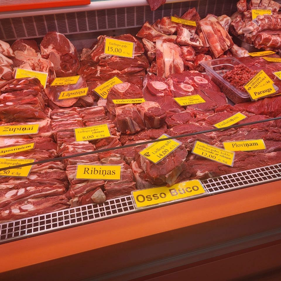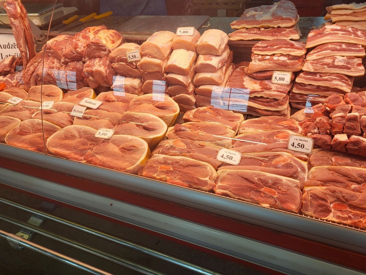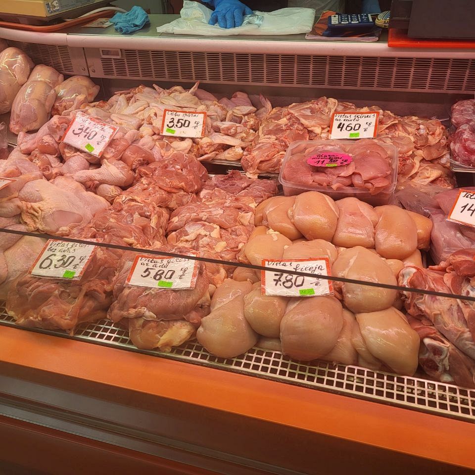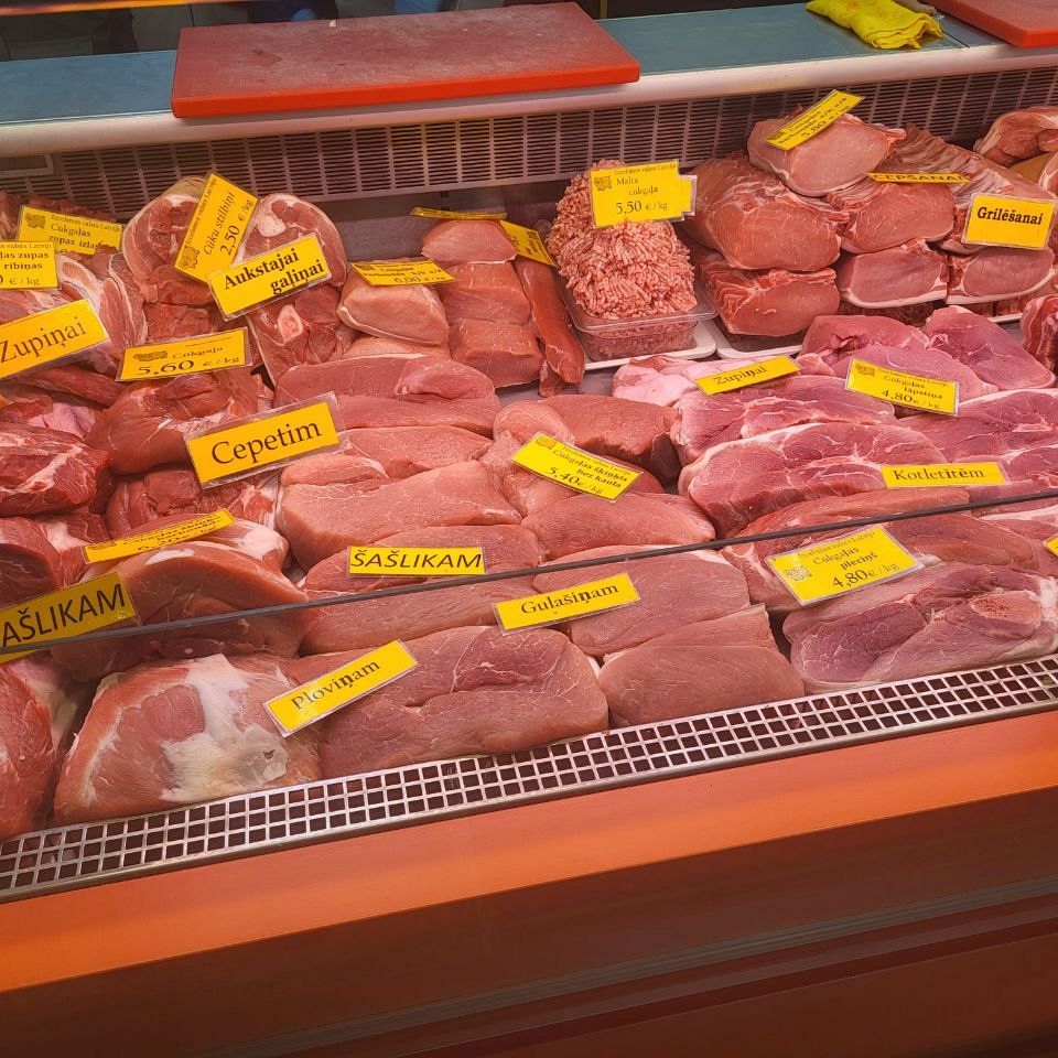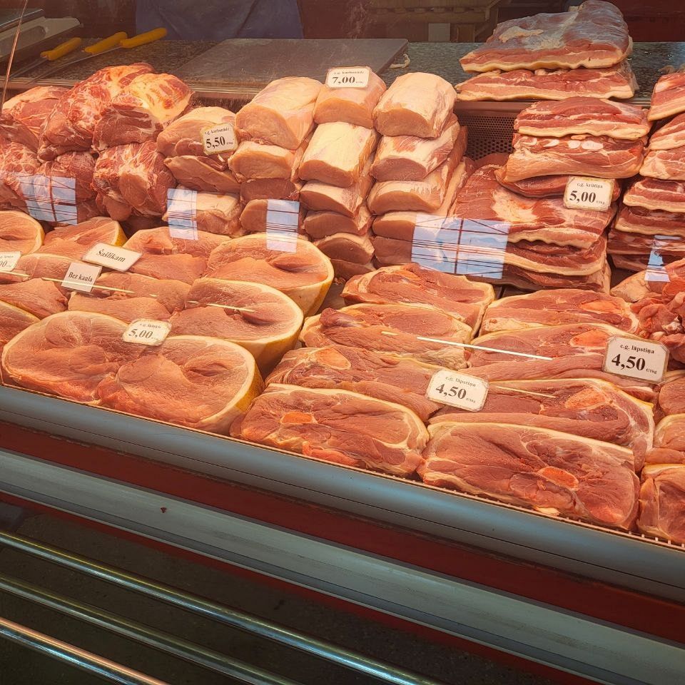 В Мясном павильоне, как говорится, без перемен - цены не меняются уже почти полгода. По-прежнему самым доступным для латвийцев остается свинина - шмат свежего мяса можно прикупить за 4-5€/кг. Но нужно считаться с тем, что филе курицы обойдется почти в два раза дороже - 7,80€/кг, но продаются и более бюджетные части птицы, например, ножки за 3,40€/кг. Самы дорогим мясом на рынке традиционно остается баранина и говядина, тут нужно рассчитывать что отдадите 10-17€/кг.