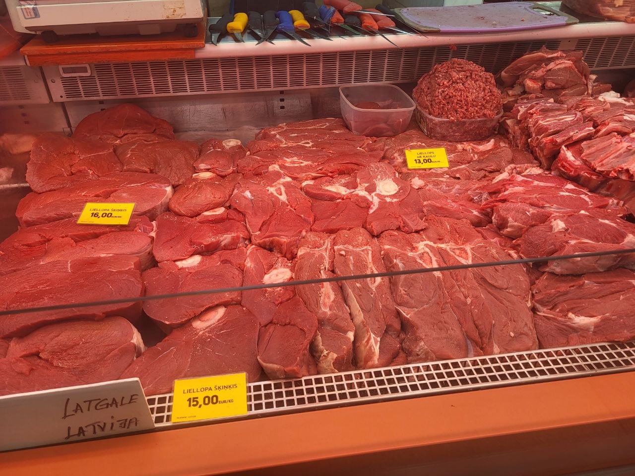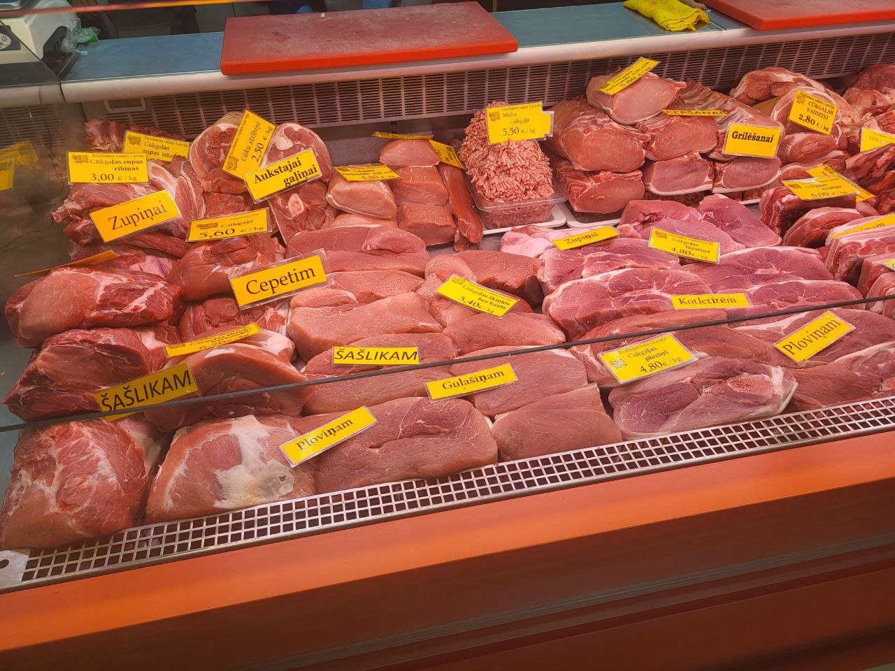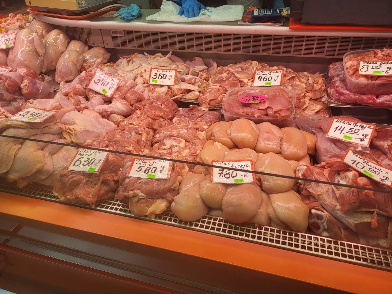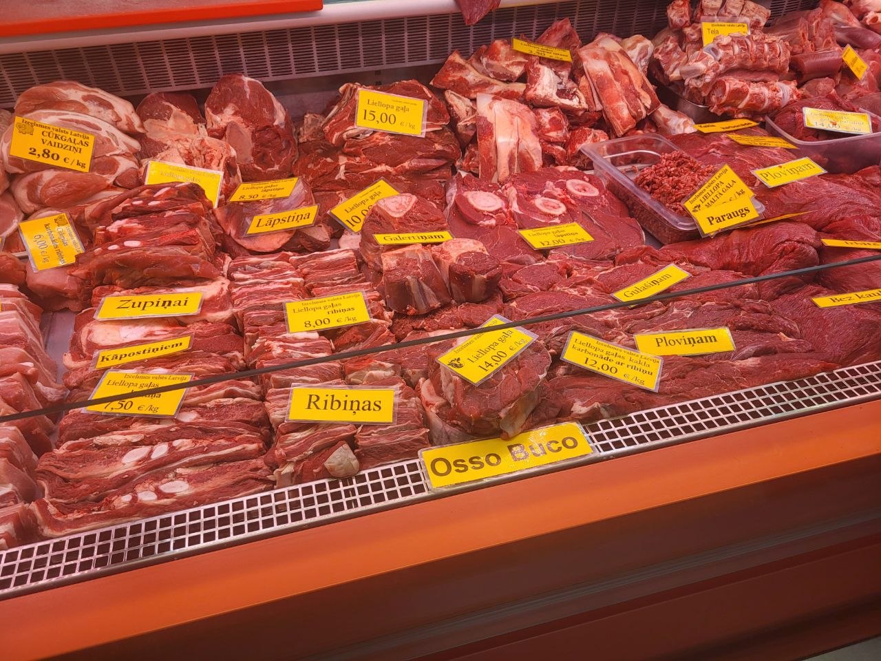 В Мясном павильоне, как говорится, без перемен - цены не меняются уже почти полгода. По-прежнему самым доступным для латвийцев остается свинина - шмат свежего мяса можно прикупить за 4-5€/кг. Но нужно считаться с тем, что филе курицы обойдется почти в два раза дороже - 7,80€/кг, но продаются и более бюджетные части птицы, например, ножки за 3,40€/кг. Самы дорогим мясом на рынке традиционно остается баранина и говядина, тут нужно рассчитывать что отдадите 10-17€/кг.
