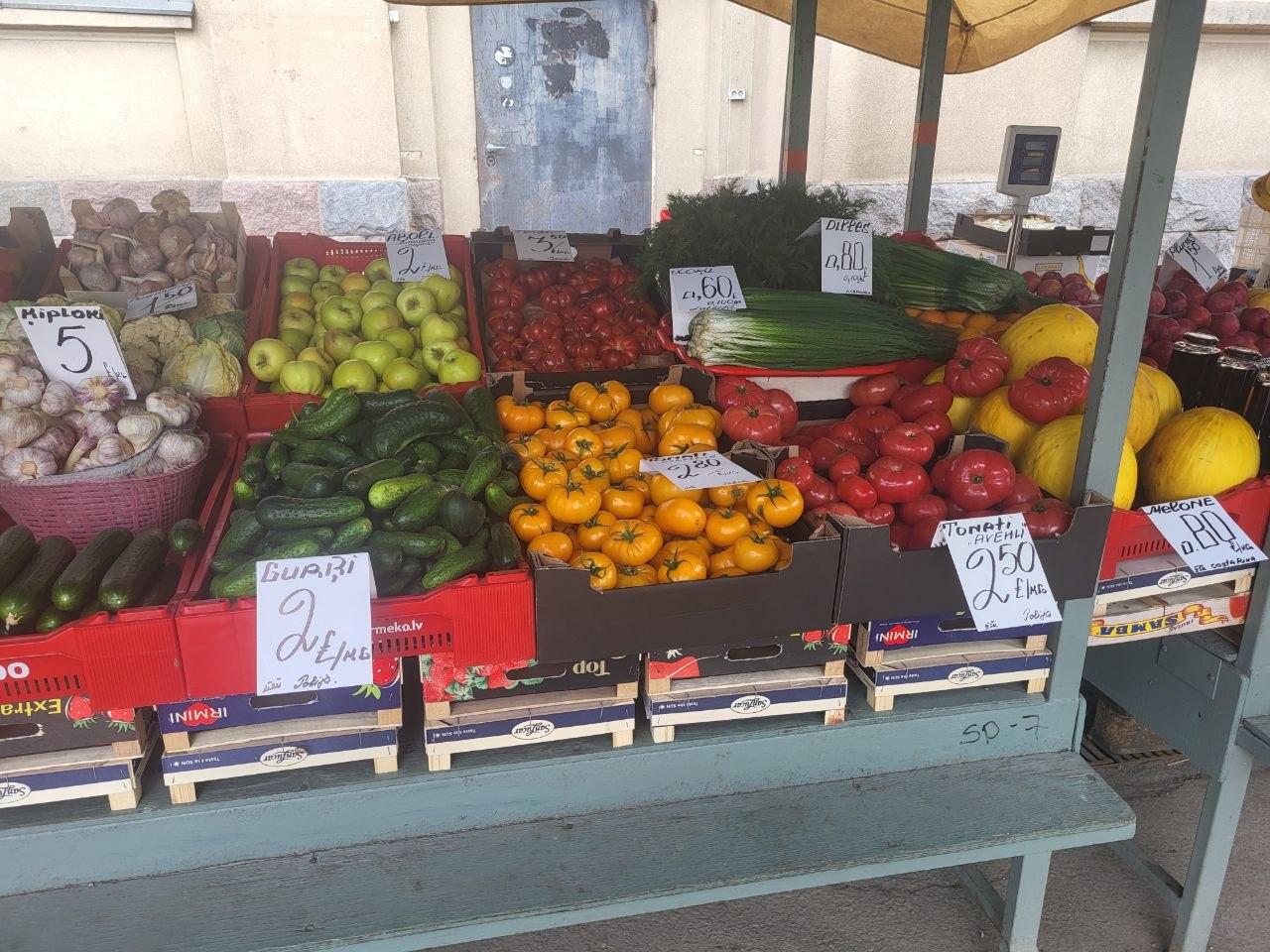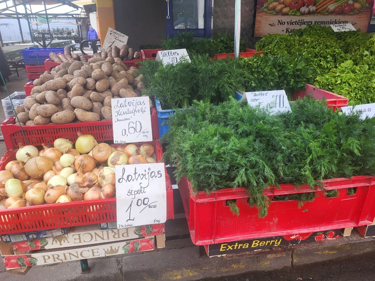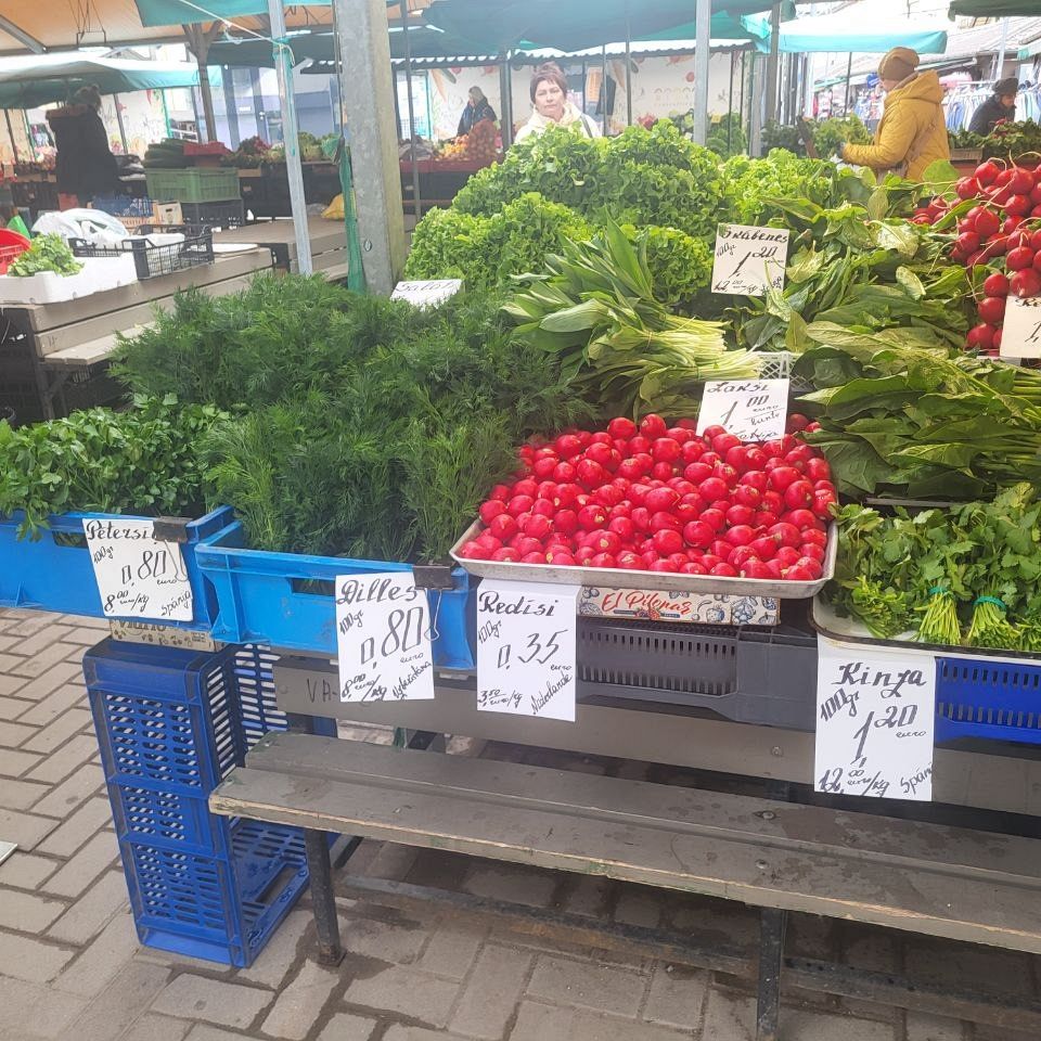 Стали более доступными и цены на польские огурцы и томаты - по 2-3 евро/кг - местных же пока не видно. Зато немного подешевел латвийский картофель, килограмм "Аннушки" можно взять за 60 центов, так же до 60-80 центов подешевела и разная "зеленушка".
