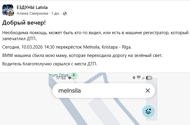 В этот вторник, 10.03.2026 в 14:30, перекрёсток Melnsila, Kristapa - Rīga.