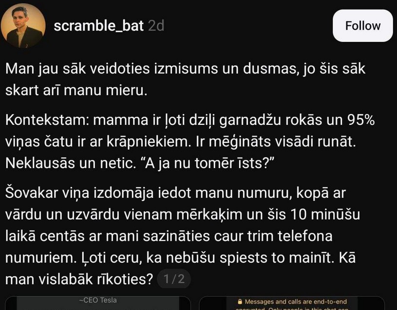 «Я начинаю впадать в отчаяние и гнев, потому что это начинает влиять на мое спокойствие. Для контекста: мама находится в руках мошенников, и 95% ее чатов — с мошенниками, - пожаловался пользователь с псевдонимом @scramble_bat на социальной платформе «Threads». - Попробовал всевозможные способы. Не слушает и не верит. «А вдруг это правда?» Сегодня вечером она решила дать мой номер вместе с именем и фамилией одному мошеннику, и тот уже через 10 минут пытался связаться со мной с трех разных телефонных номеров. Очень надеюсь, что мне не придется его менять. Как мне лучше поступить?».