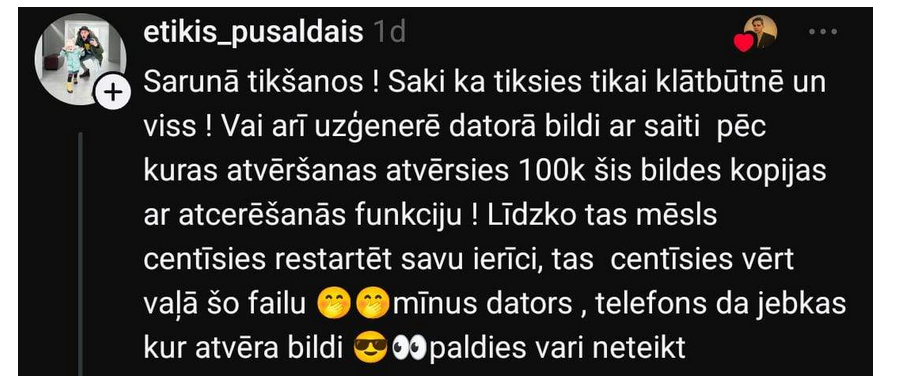 Пользователь под ником Этикис Пусалдайс советует: «Срочно договоись о встрече  [с мошенниками]! Скажи, что встретишься только лично — и всё! Или же они сгенерируют в компьютере картинку со ссылкой, после открытия которой у тебя откроются 100 тысяч копий этого изображения с функцией восстановления! Затем это дерьмо будет пытаться перезагрузить твоё устройство, будет пытаться открыть этот файл — минус компьютер, телефон, да вообще всё, где ты открыл картинку. Можешь не благодарить».
