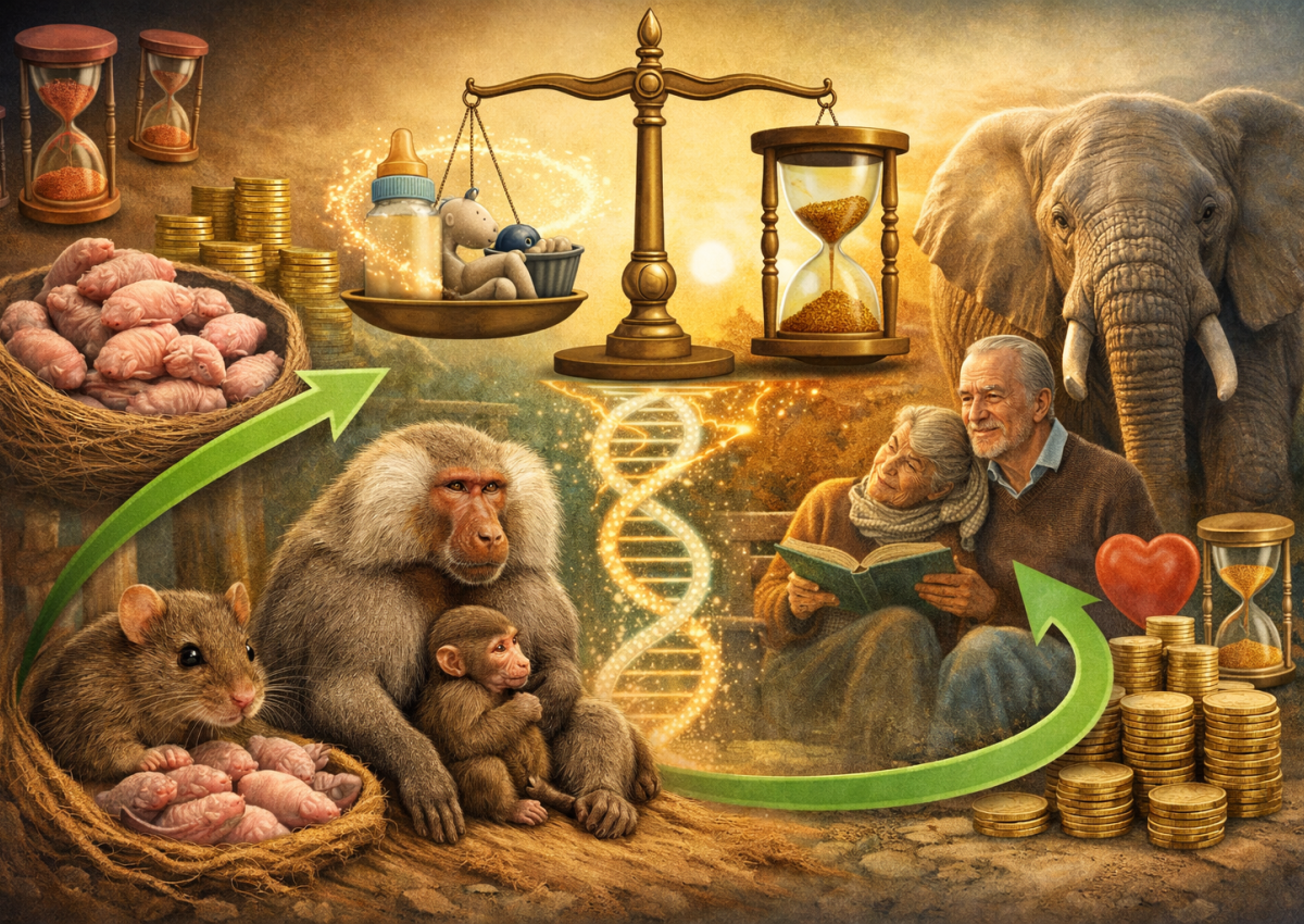 Логика проста и жестока. У организма ограниченный «энергобюджет». Его можно тратить либо на детей, либо на собственное тело. Слон живёт до 80 лет, но рожает всего несколько детёнышей. Мышь — наоборот: живёт пару лет, зато способна произвести десятки потомков. Эволюция заставляет выбирать.