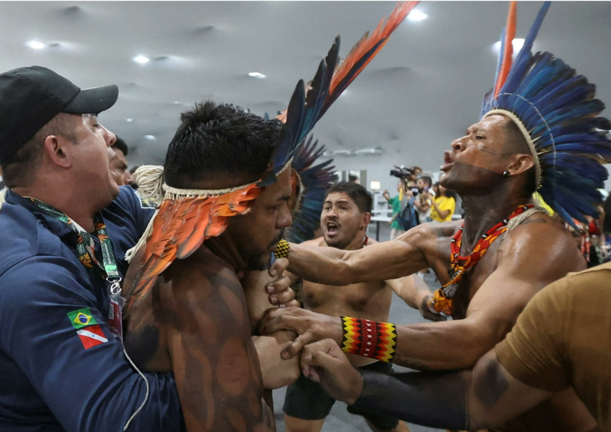 Протестующие — в том числе члены племён кайапо, тупи и шаванте — ворвались в одно из зданий конференции, выкрикивая лозунги «Амазония — не товар!» и «Мы не статистика, мы живые люди!».