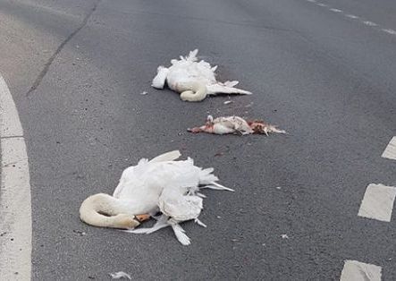 На шоссе Рига-Лиепая обнаружены тела сразу четырех лебедей. Местные жители говорят, птицы жили здесь три года. Скорее всего пернатых сбила машина.