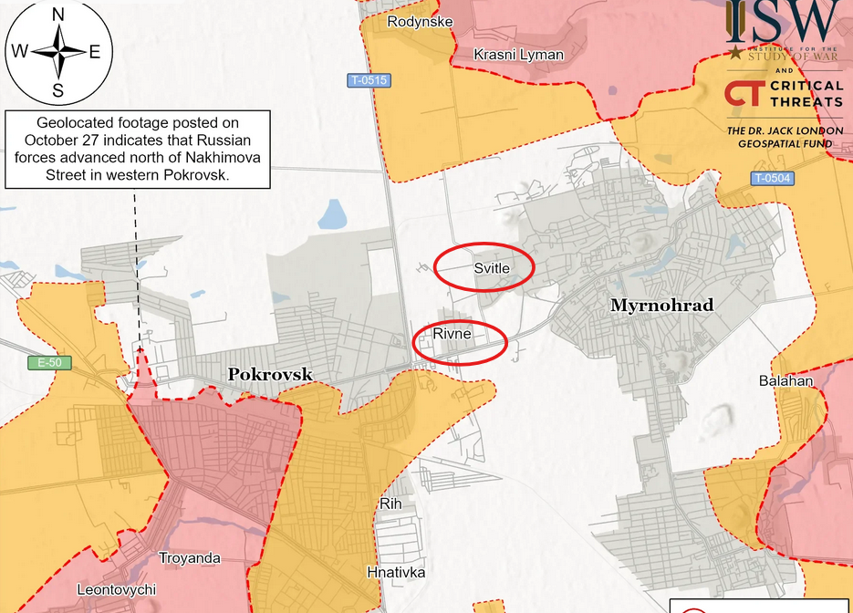 Еще одним направлением, по которому в настоящее время наступают русские, являются попытки перерезать шоссе Покровска–Родинска, которое украинские вооруженные силы по-прежнему используют для операций по снабжению и эвакуации.