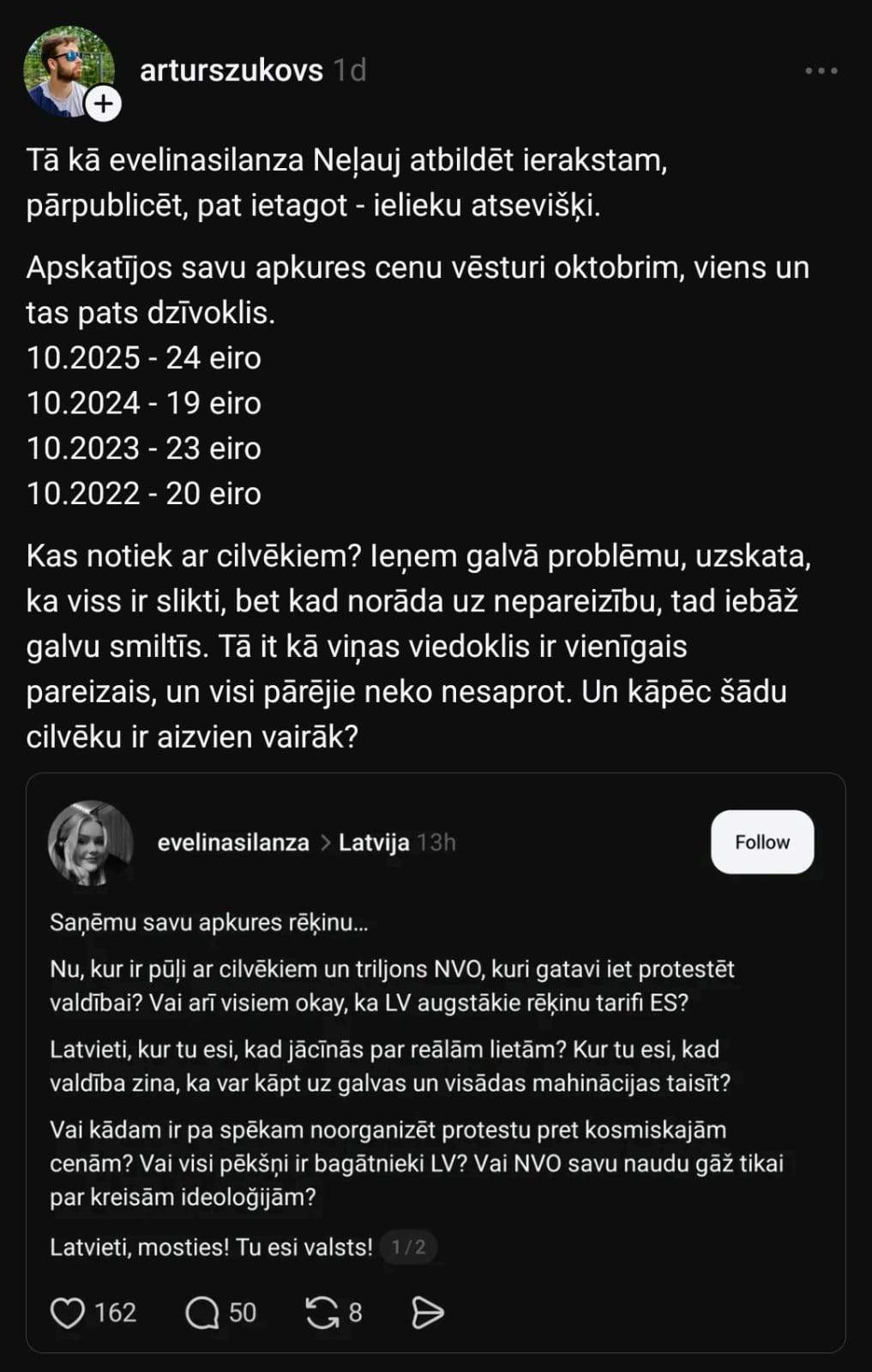 Лаура считает, что подобные дискуссии возникают потому, что «троллям нужно ненавидеть всё плохое в Латвии». Она добавляет, что мало знает о ценах в Риге, но, живя в Валмиере и переезжая в Лиепаю, она считает, что отопление стоит не так дорого.