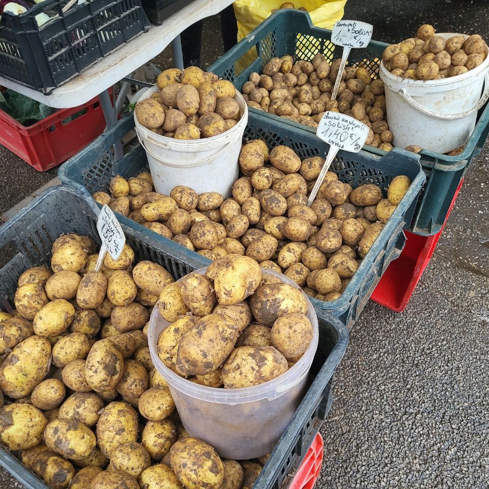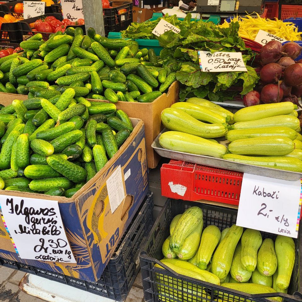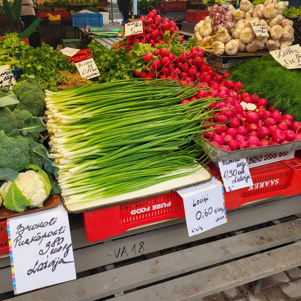 Так, по ценам на вечер понедельника, 7 июля, молодой картофель стоил от одного до полутора евро за килограмм, свежие огурчики и помидоры около двух-трех евро, различная зелень 60-70 центов за пучок. Капуста обычная тоже от одного до полутора евро, а вот цветная уже дороже - 3,50, брокколи от 3 до 4 евро. Лук зеленый - 60 центов, репчатый около 2 евро за кг, чеснок от 60 доо 80 центов за штуку. Появились на прилавках и стручки зеленого горошка - тут цена уже от 4 до 6 евро. Это все в основном уже местные, латвийские овощи и зелень.