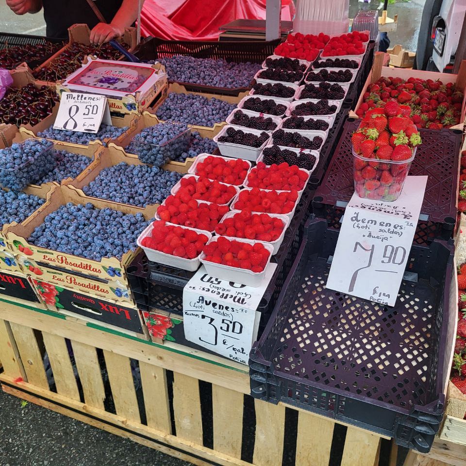 А вот ягода в основном привозная: клубника стоит от 3 до 5 евро, крупную черешни и вишню можно приобрести по 5-7 евро за кг, черника за 8-9 евро кг. На прилавках можно даже встретить даже малину, ежевика и даже первые грибы-лисички. Тут, что бы не травмировать психику покупателей огромными ценами за килограмм, находчивые продавцы нашли выход - продают их в контейнерах по 200-300 грамм по 3-4 евро. А арбузы и дыни сейчас можно купить по 2-3 евро за кг, хотя и тут кроется хитрая ловушка - даже в маленькой дыньке будет не меньше 2-3 кило веса.